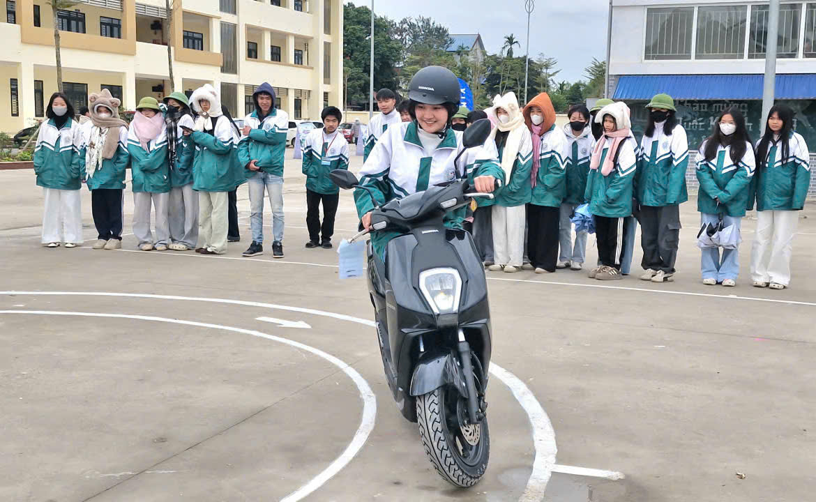 Phần thực hành được tổ chức trực quan tại sân trường với các nội dung như: Đội mũ bảo hiểm đúng quy cách, tư thế ngồi lái xe an toàn, kỹ thuật lên xuống xe, sử dụng ga - phanh, dừng xe đúng quy định và thực hành các bài hình liên hoàn cơ bản. Thông qua hình thức hướng dẫn sinh động, dễ hiểu, nhiều học sinh tích cực tham gia, từng bước hình thành kỹ năng điều khiển xe an toàn, đúng kỹ thuật.