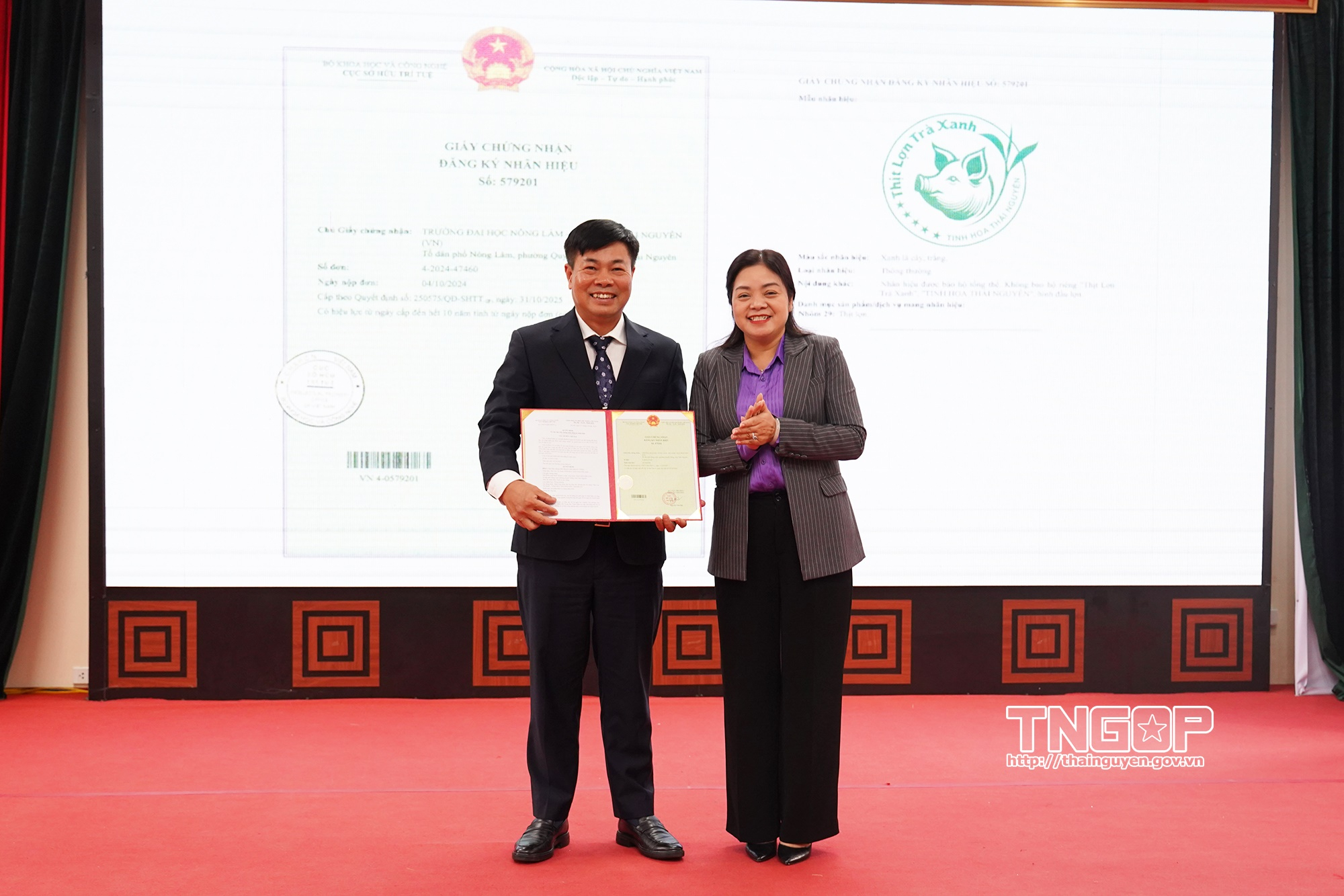 Đồng chí Nguyễn Thị Loan, Phó Chủ tịch UBND tỉnh trao Giấy chứng nhận nhãn hiệu "Thịt lợn trà xanh - Tinh hoa Thái Nguyên" cho Đại học Nông Lâm