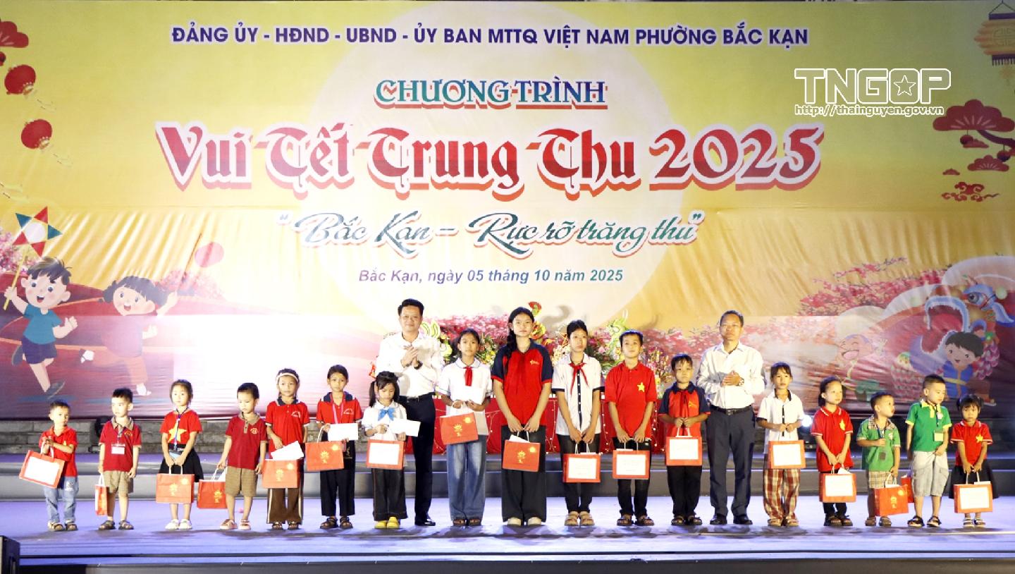 Tối 5/10, trong tiết trời thu dịu mát, tại sân Quảng trường Nhà văn hóa phường Bắc Kạn, Chương trình vui tết Trung thu năm 2025 với chủ đề “Bắc Kạn rực rỡ trăng thu” do Đảng ủy, HĐND, UBND, Ủy ban MTTQ phường tổ chức đã mang đến không khí vui tươi, ấm áp và nhiều niềm vui cho hơn 4.000 thiếu niên, nhi đồng trên địa bàn.
