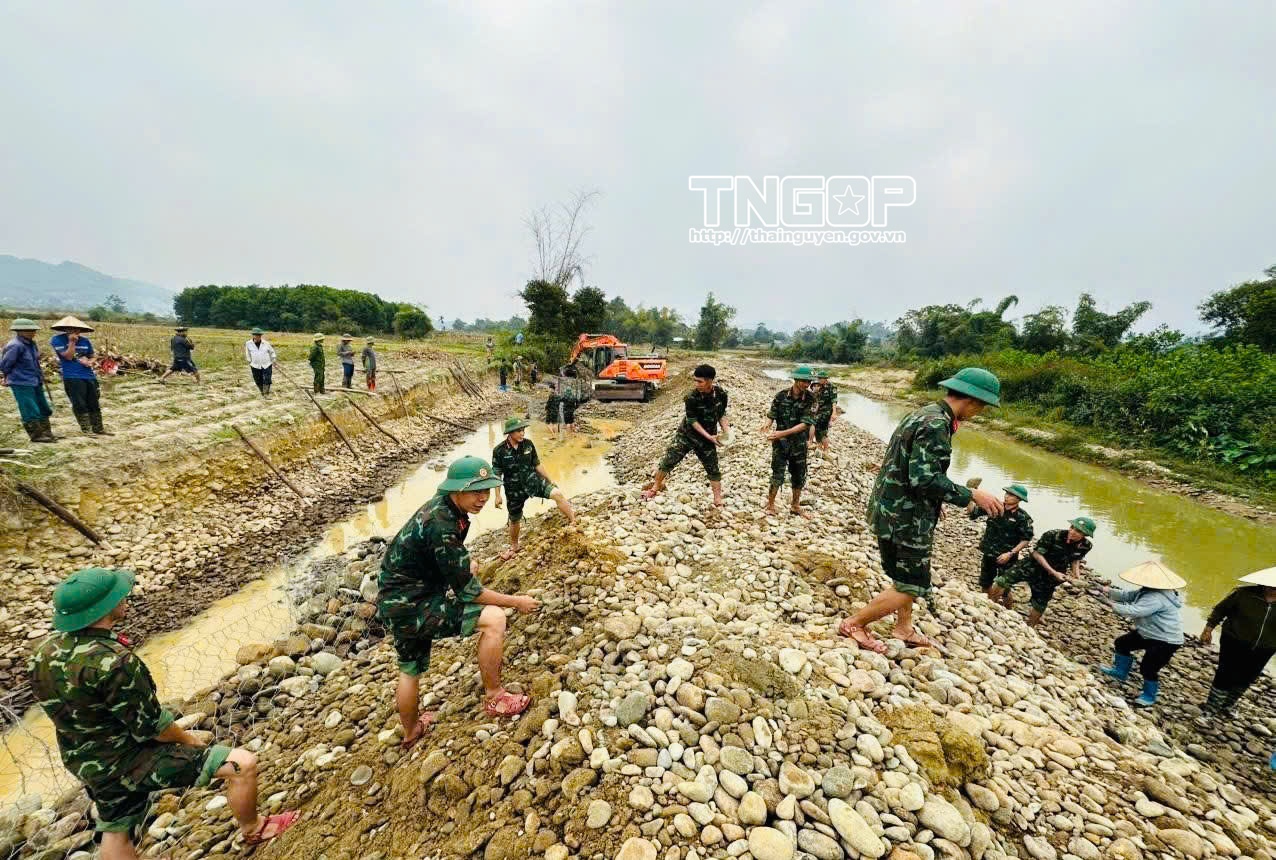 Ngày 6/12, Trung đoàn bộ binh 832 đã huy động gần 30 cán bộ, chiến sĩ Đại đội 1, Tiểu đoàn 1, xuống địa bàn xã Đại Từ, phối hợp với cấp ủy, chính quyền địa phương và Nhân dân xóm Đình 7 triển khai kè bờ suối, khắc phục tình trạng sạt lở dọc suối Cái. Trước nguy cơ sạt lở tiếp tục lan rộng, đe dọa diện tích đất sản xuất của bà con, lực lượng đơn vị nhanh chóng tổ chức vận chuyển vật liệu, gia cố các vị trí xung yếu, nhằm bảo đảm an toàn bờ suối khi mùa mưa lũ đến gần.