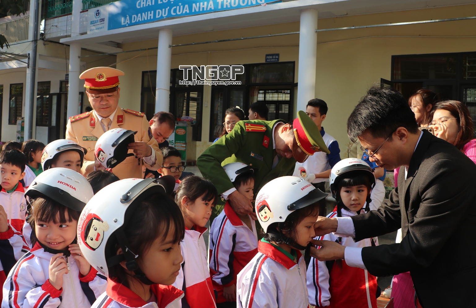 Trao mũ bảo hiểm đạt chuẩn cho học sinh lớp 1 Trường Tiểu học Trưng Vương