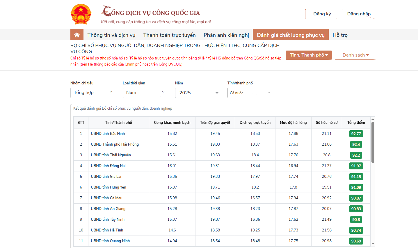 Theo kết quả công bố trên Cổng Dịch vụ công quốc gia, tính đến ngày 9/12/2025, tỉnh Thái Nguyên vươn lên đứng thứ 3 toàn quốc trong Bộ Chỉ số chỉ đạo, điều hành và đánh giá chất lượng phục vụ người dân, doanh nghiệp trong thực hiện thủ tục hành chính (TTHC), dịch vụ công thời gian thực trên môi trường điện tử, đạt 92,2 điểm, nằm trong nhóm các tỉnh xuất sắc. Đây cũng là thứ hạng tốt nhất của tỉnh trong vòng 2 tháng trở lại đây.