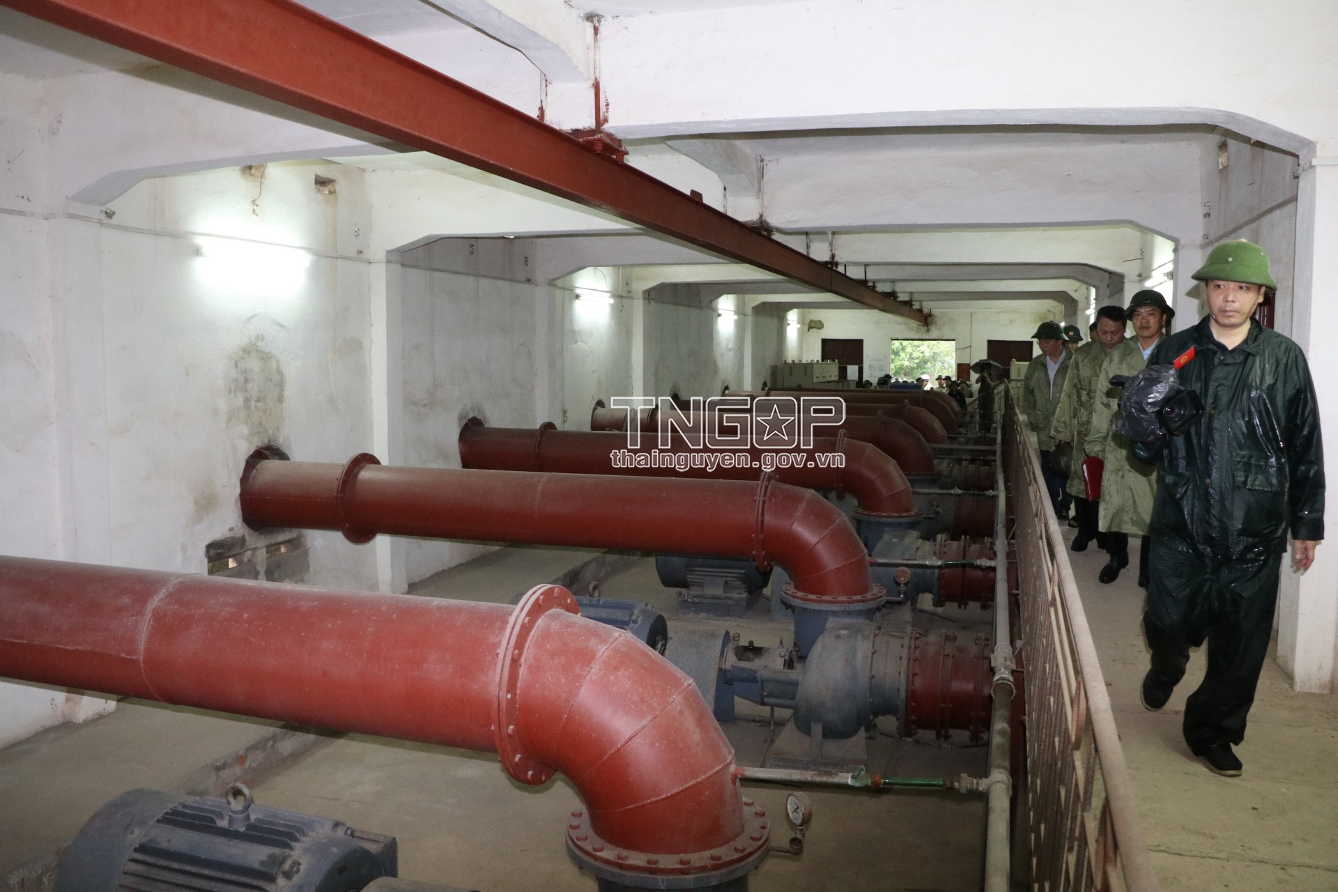 Đoàn công tác của tỉnh kiểm tra các thiết bị máy bơm tiêu úng của Trạm bơm tiêu Cống Táo, xã Thuận Thành (TP. Phổ Yên) sáng 07/9