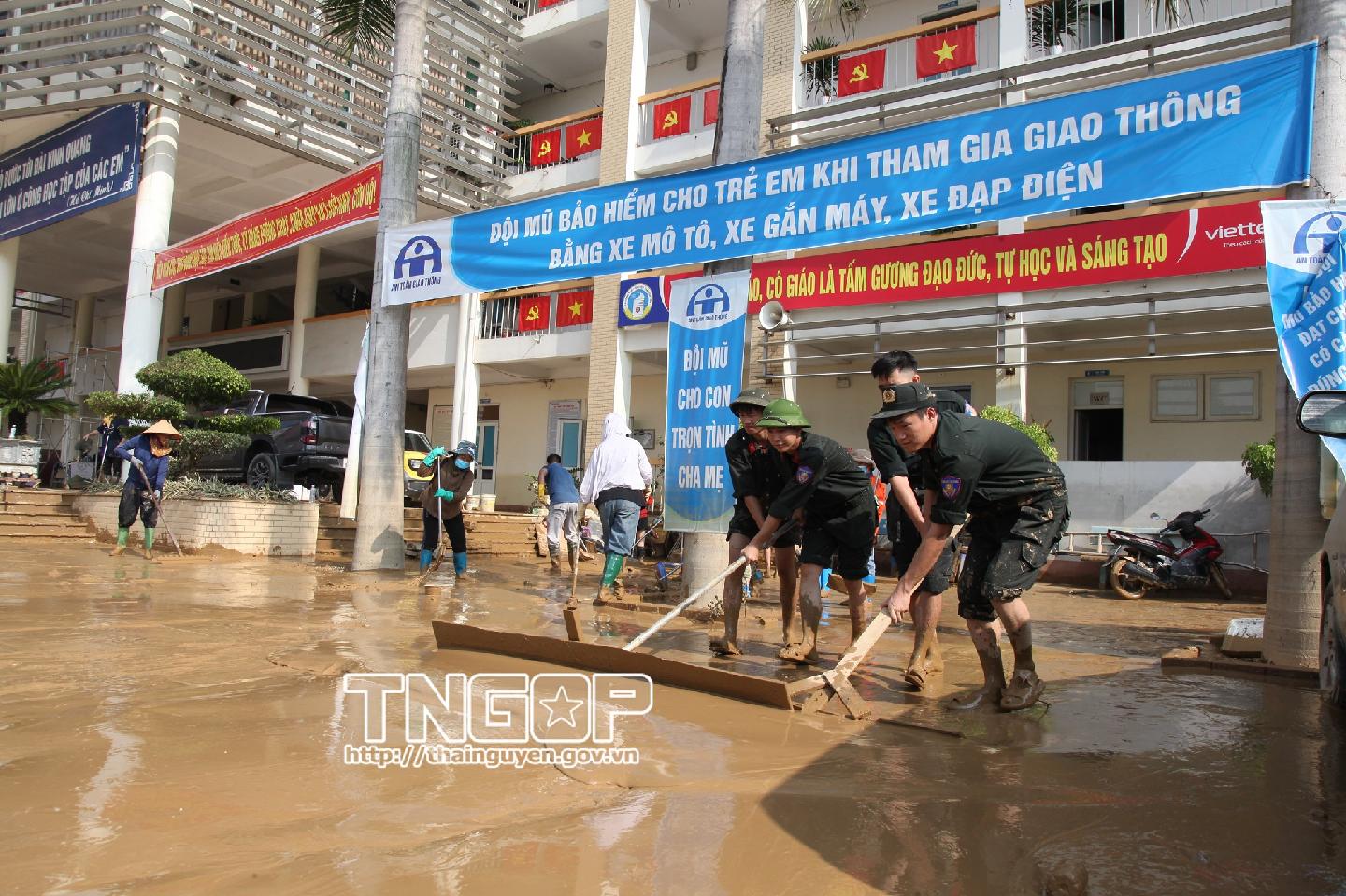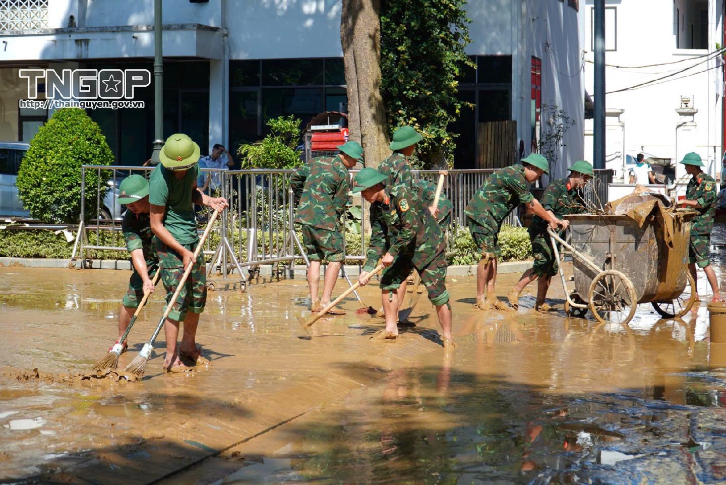 Sau khi hoàn lưu bão số 11 gây mưa lớn, ngập lụt diện rộng trên địa bàn tỉnh Thái Nguyên, nhiều khu dân cư, trường học, cơ quan, tuyến đường bị bao phủ bởi lớp bùn đất dày và rác thải ngổn ngang. Nhằm hỗ trợ người dân sớm ổn định cuộc sống, Giám đốc Công an tỉnh Thái Nguyên đã chỉ đạo huy động toàn bộ lực lượng, phối hợp với chính quyền và các đoàn thể địa phương tổ chức dọn dẹp, vệ sinh môi trường với phương châm “nước rút đến đâu, vệ sinh đến đó”.