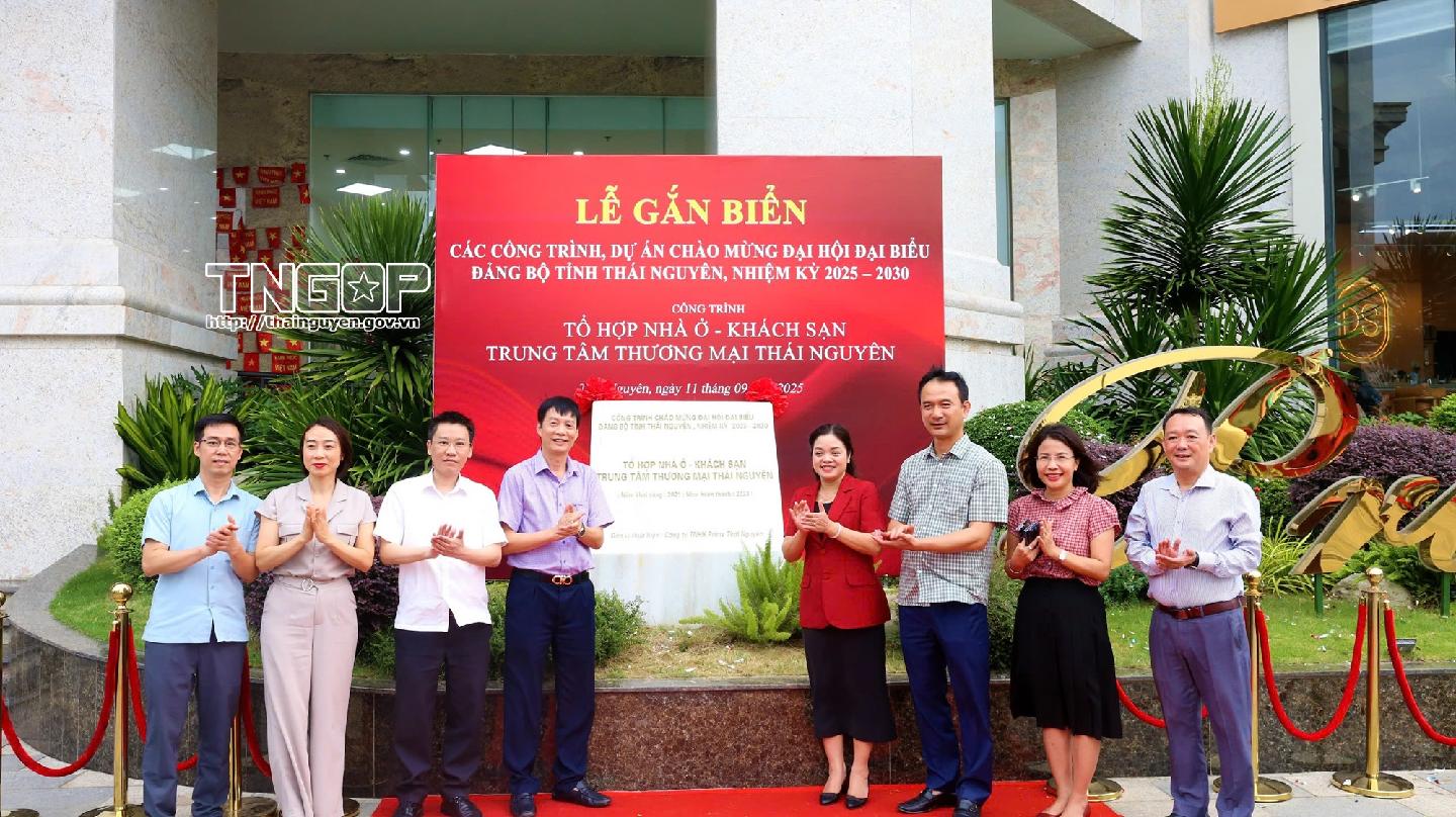 Gắn biển công trình Tổ hợp Nhà ở - Khách sạn - Trung tâm thương mại Thái Nguyên chào mừng Đại hội đại biểu Đảng bộ tỉnh lần thứ I