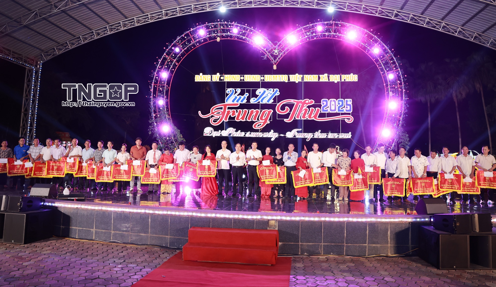 Các đồng chí lãnh đạo tặng thưởng cho các đơn vị tham gia cuộc thi mô hình đèn xã Đại Phúc