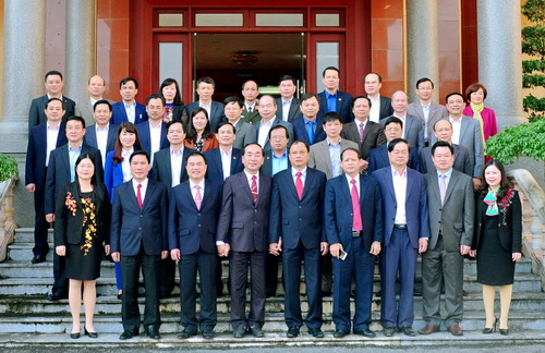 Đoàn công tác của tỉnh Thái Nguyên, tỉnh Bắc Kạn chụp ảnh lưu niệm trong buổi thăm, làm việc giữa 2 tỉnh nhân dịp Kỷ niệm 20 năm Ngày tái lập tỉnh Thái Nguyên và tỉnh Bắc Kạn. (Ảnh: Quang Hưng)