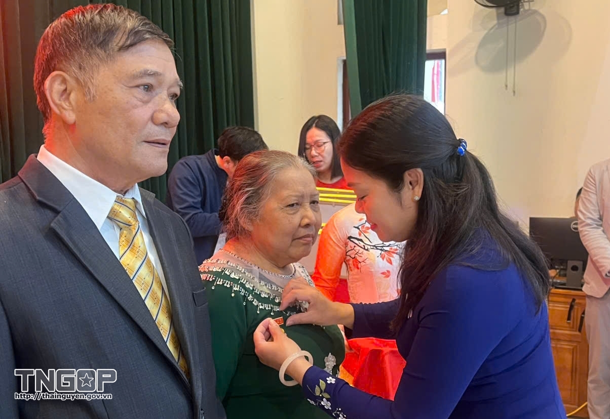 Đồng chí Nguyễn Thị Loan, Phó Chủ tịch UBND tỉnh và đồng chí Đinh Công Ích, Phó Bí thư Đảng ủy xã Tân Cương trao Huy hiệu Đảng cho đảng viên
