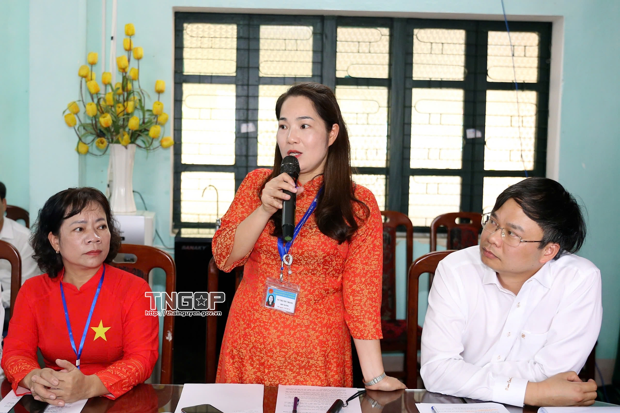 Đồng chí Vy Thị Thu Trang, Hiệu trưởng Trường PTDT nội trú THPT số 2 Thái Nguyên báo cáo đồng chí Bí thư Tỉnh ủy về nhu cầu được học tại Nhà trường của con em đồng bào các dân tộc thiểu số khu vực phía Bắc của tỉnh Thái Nguyên