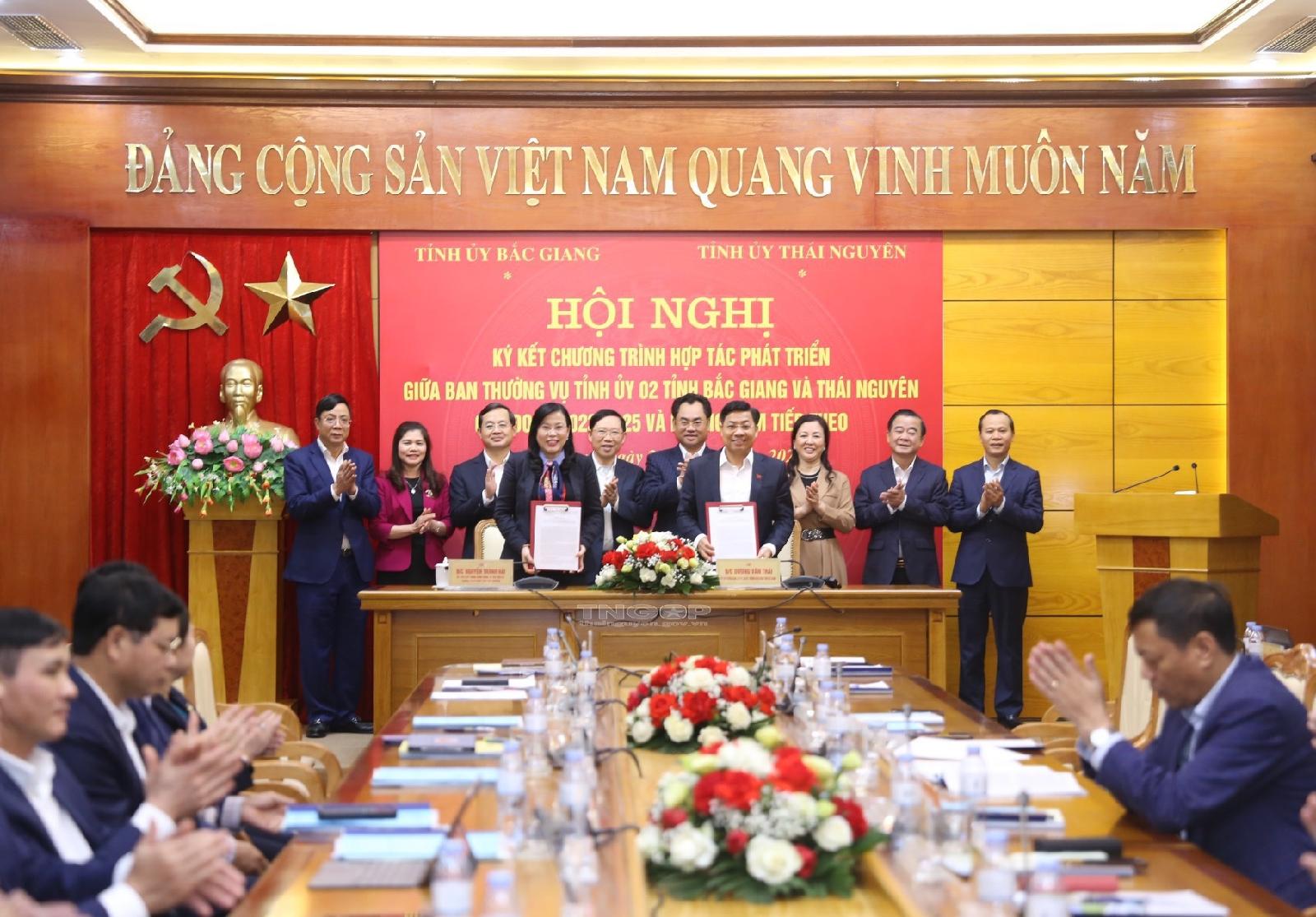 Chiều ngày 29/3, tại trụ sở Tỉnh ủy Bắc Giang đã diễn ra Lễ ký kết Chương trình hợp tác phát triển giữa Ban Thường vụ Tỉnh ủy hai tỉnh Thái Nguyên và Bắc Giang, giai đoạn 2023 - 2025 và những năm tiếp theo. Đồng chí Dương Văn Thái, Ủy viên BCH Trung ương Đảng, Bí thư Tỉnh ủy, Trưởng Đoàn ĐBQH tỉnh Bắc Giang và đồng chí Nguyễn Thanh Hải, Ủy viên BCH Trung ương Đảng, Bí thư Tỉnh ủy, Trưởng Đoàn ĐBQH tỉnh Thái Nguyên đồng chủ trì Hội nghị.