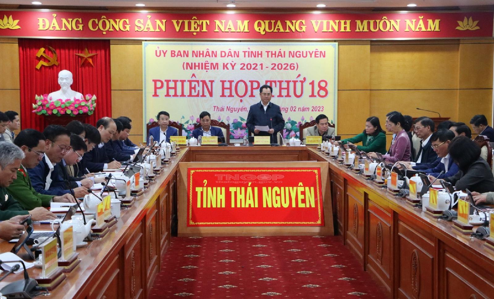 Sáng nay (3/2), đồng chí Trịnh Việt Hùng, Ủy viên dự khuyết BCH Trung ương Đảng, Phó Bí thư Tỉnh ủy, Chủ tịch UBND tỉnh chủ trì Phiên họp thứ 18, UBND tỉnh Thái Nguyên, nhiệm kỳ 2021 - 2026 để thảo luận, đánh giá tình hình kinh tế - xã hội tháng 01 và nhiệm vụ trọng tâm tháng 02 năm 2023; đồng thời cho ý kiến vào một số nội dung báo cáo, tờ trình của UBND tỉnh trình xin ý kiến Ban Thường vụ Tỉnh ủy và HĐND tỉnh Thái Nguyên.