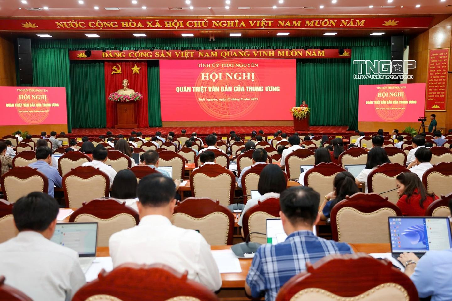 Chiều 15/8, Tỉnh ủy Thái Nguyên tổ chức Hội nghị quán triệt các văn bản của Trung ương. Dự và chỉ đạo tại Hội nghị có đồng chí Trịnh Việt Hùng, Ủy viên dự khuyết Ban Chấp hành Trung ương Đảng, Bí thư Tỉnh ủy. Tham dự Hội nghị có các đồng chí Thường trực Tỉnh ủy, Ủy viên Ban Thường vụ Tỉnh ủy, Ủy viên Ban Chấp hành Đảng bộ tỉnh, các đồng chí cán bộ chủ chốt cấp tỉnh.