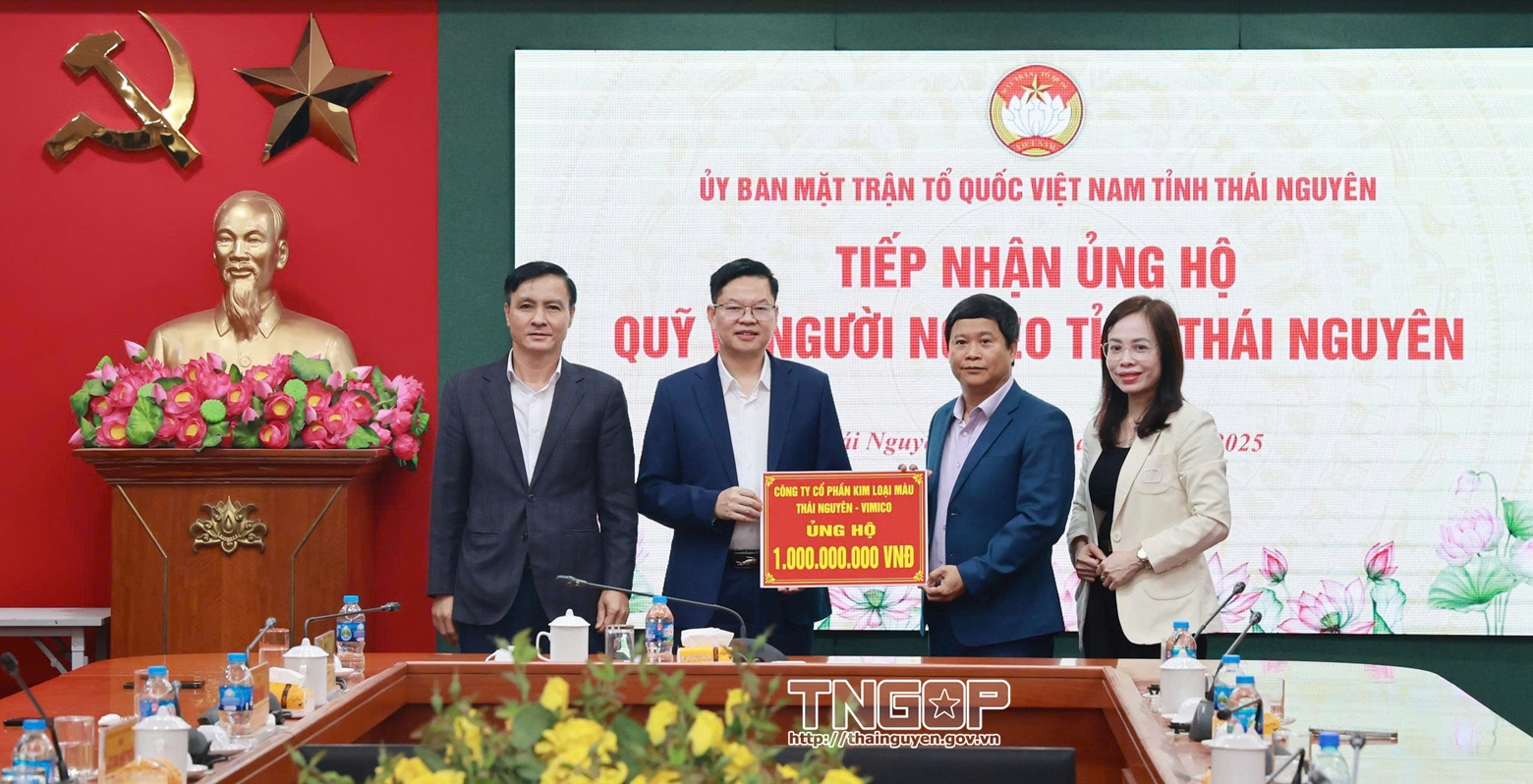 Sáng 24/12, tại Tỉnh ủy Thái Nguyên, Công ty cổ phần Kim loại màu Thái Nguyên - Vimico đã trao tặng 1 tỷ đồng ủng hộ Quỹ Vì người nghèo của tỉnh. Dự tiếp nhận hỗ trợ có đồng chí Đinh Quang Tuyên, Phó Bí thư Tỉnh ủy, Chủ tịch Ủy ban MTTQ tỉnh; đồng chí Vũ Duy Hoàng, Ủy viên Ban Thường vụ Tỉnh ủy, Phó Chủ tịch Thường trực Ủy ban MTTQ tỉnh.