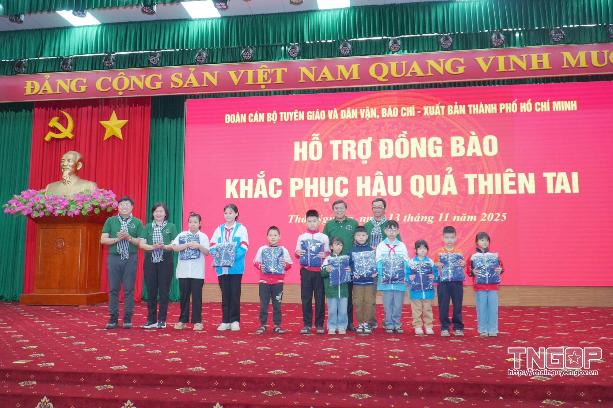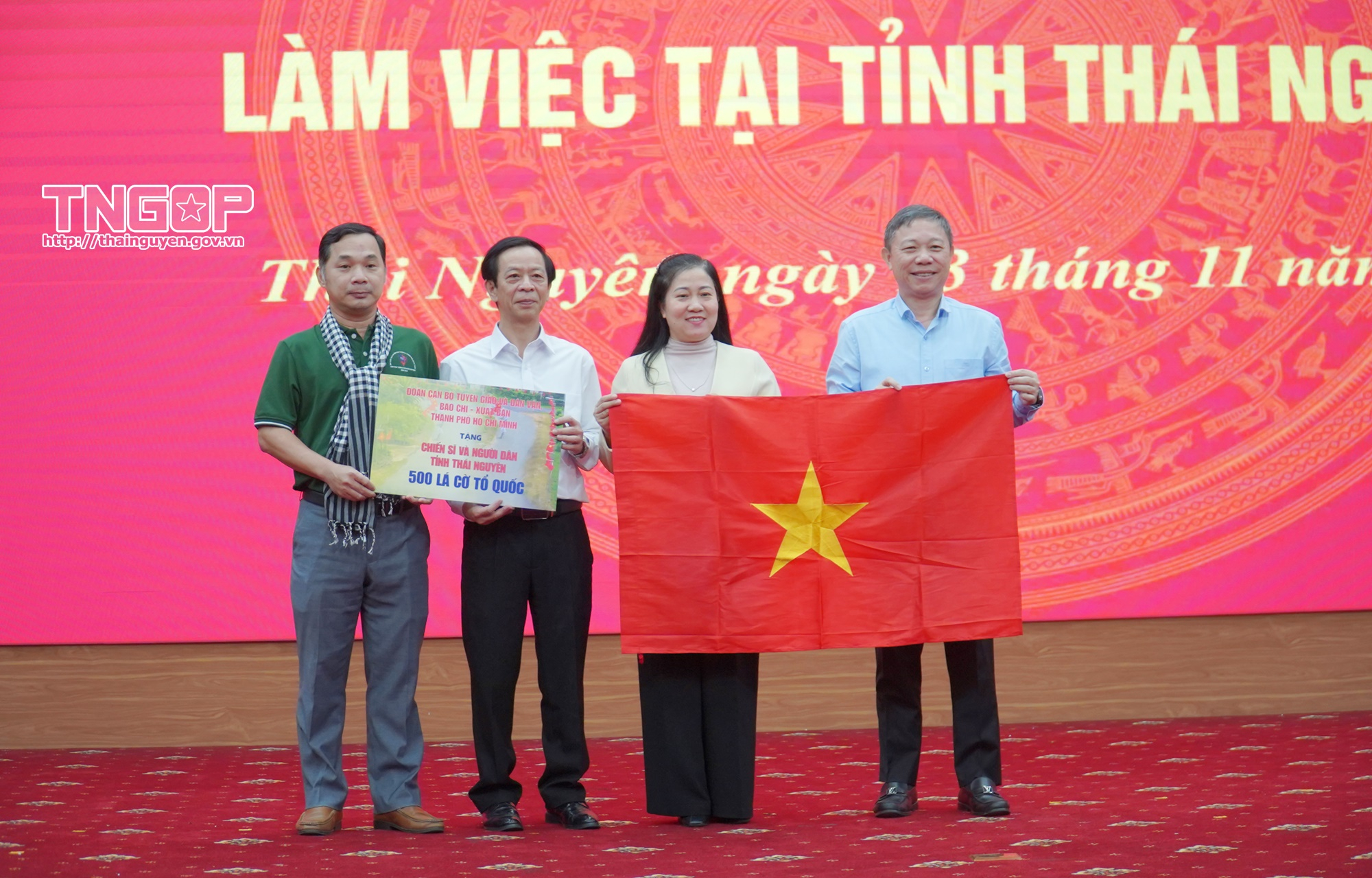 Nhân dịp này, Đoàn công tác đã trao tặng 500 lá cờ Tổ quốc cho tỉnh Thái Nguyên; trao quà cho 20 hộ gia đình chính sách có hoàn cảnh khó khăn trên địa bàn tỉnh, mỗi suất trị giá 1 triệu đồng; trao quà cho 30 hộ gia đình có hoàn cảnh khó khăn bị ảnh hưởng bởi bão lũ, mỗi suất trị giá 3 triệu đồng; tặng quà cho 50 em học sinh có hoàn cảnh khó khăn; trao tủ sách thiếu nhi và 1 tủ sách không gian văn hóa Hồ Chí Minh; trao áo ấm cho các hộ có hoàn cảnh khó khăn.
