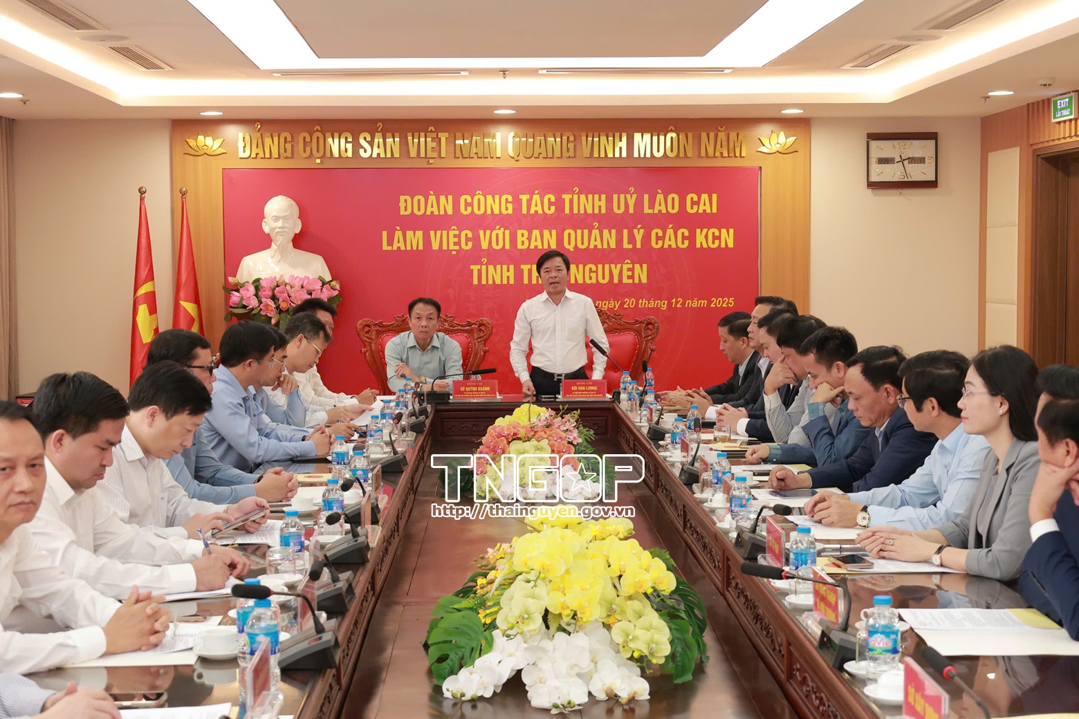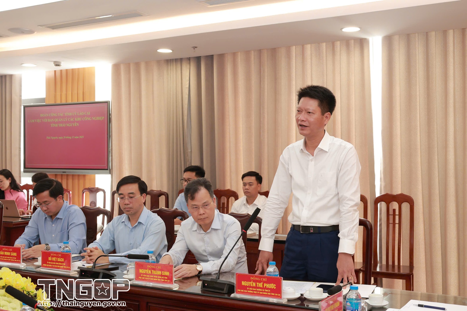 Thay mặt Đoàn công tác tỉnh Lào Cai, đồng chí Nguyễn Thế Phước, Ủy viên BTV Tỉnh ủy, Phó Chủ tịch Thường trực UBND tỉnh bày tỏ ấn tượng với sự phát triển của tỉnh Thái Nguyên, đặc biệt về phát triển KCN và thu hút đầu tư - những lĩnh vực tỉnh Thái Nguyên luôn đi đầu trong khu vực. Đồng chí thông tin: Tỉnh Lào Cai sau sáp nhập có nhiều nét tương đồng với Thái Nguyên, tuy nhiên, mặc dù công nghiệp chiếm ưu thế trong quy mô kinh tế, địa phương vẫn đang gặp một số khó khăn, vướng mắc. Đồng chí mong muốn, thông qua chuyến thăm và làm việc, tỉnh Lào Cai sẽ được lắng nghe, trao đổi những kinh nghiệm về phát triển công nghiệp, đặc biệt là công tác quy hoạch, xác định vị trí phù hợp để đảm bảo hiệu quả đầu tư hạ tầng và thu hút đầu tư, công tác giải phóng mặt bằng gắn với bố trí tái định cư - đây là những điểm sáng giúp cho Thái Nguyên luôn là điểm đến đầu tư hấp dẫn của các nhà đầu tư trong và ngoài nước.