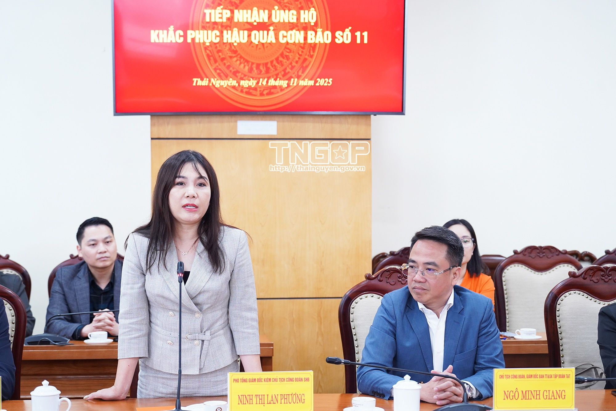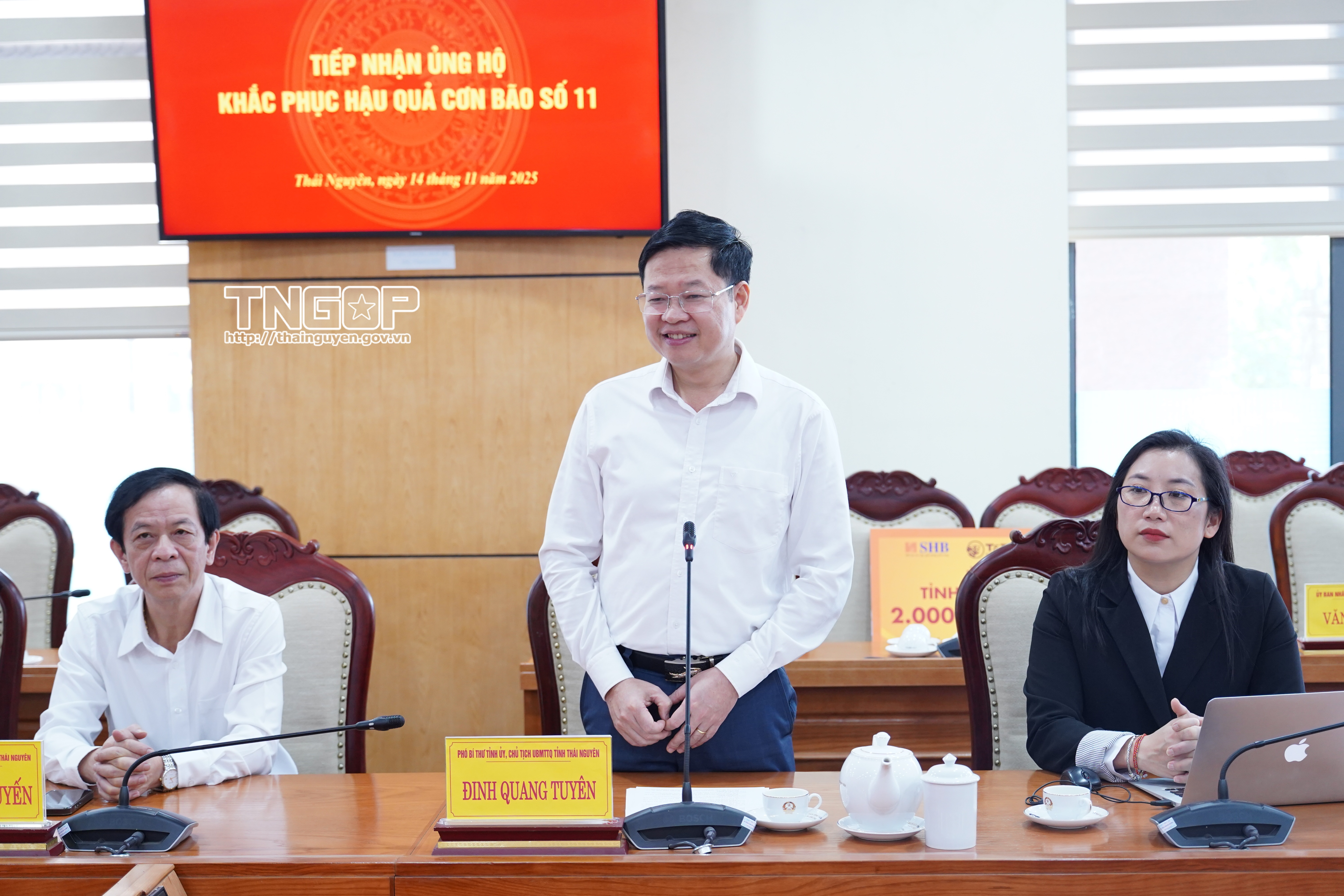 Thay mặt lãnh đạo tỉnh Thái Nguyên, đồng chí Đinh Quang Tuyên, Phó Bí thư Tỉnh ủy, Chủ tịch Ủy ban MTTQ tỉnh trân trọng cảm ơn Ngân hàng SHB đã quan tâm, hỗ trợ tỉnh khắc phục hậu quả thiên tai. Đây là nguồn động viên rất ý nghĩa, thể hiện tinh thần trách nhiệm xã hội và sự sẻ chia sâu sắc của SHB đối với bà con vùng bị ảnh hưởng. Đồng chí mong muốn SHB tiếp tục đồng hành triển khai các hoạt động xã hội - cộng đồng trên địa bàn tỉnh, đặc biệt là các chương trình hỗ trợ người dân vùng thiên tai, góp phần lan tỏa tinh thần sẻ chia và trách nhiệm đối với cộng đồng.