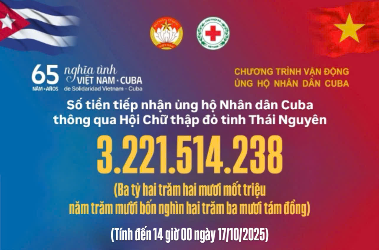 Trước đó, hưởng ứng Lời kêu gọi của Trung ương Hội Chữ thập đỏ Việt Nam về việc ủng hộ Nhân dân Cuba khắc phục khó khăn, Hội Chữ thập đỏ tỉnh Thái Nguyên đã phát động đợt tuyên truyền và vận động ủng hộ rộng rãi trong toàn tỉnh. Sau một thời gian triển khai, phong trào đã nhận được sự hưởng ứng tích cực của các cấp hội, cơ quan, đơn vị, doanh nghiệp và đông đảo Nhân dân. Tính đến 15h00 ngày 17/10/2025, tổng số tiền Hội Chữ thập đỏ tỉnh Thái Nguyên vận động được trên 3,2 tỷ đồng.