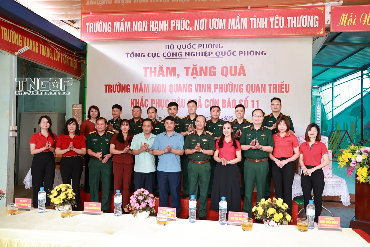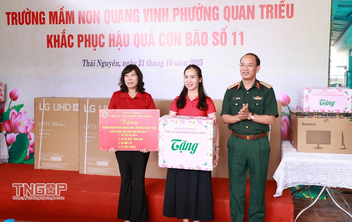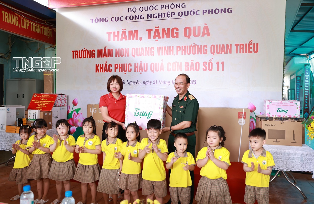 Dịp này, Tổng cục Công nghiệp quốc phòng trao tặng Trường Mầm non Quang Vinh 5 tivi, 3 bộ máy tính để bàn, 3 máy in, 1 bộ máy chiếu với tổng kinh phí 180 triệu đồng. Ngoài ra Tổng cục Công nghiệp quốc phòng cũng trao tặng quà cho học sinh của Nhà trường. Sự ủng hộ này là nguồn động viên kịp thời, góp phần phục vụ hiệu quả công tác dạy và học của Nhà trường sau bão.