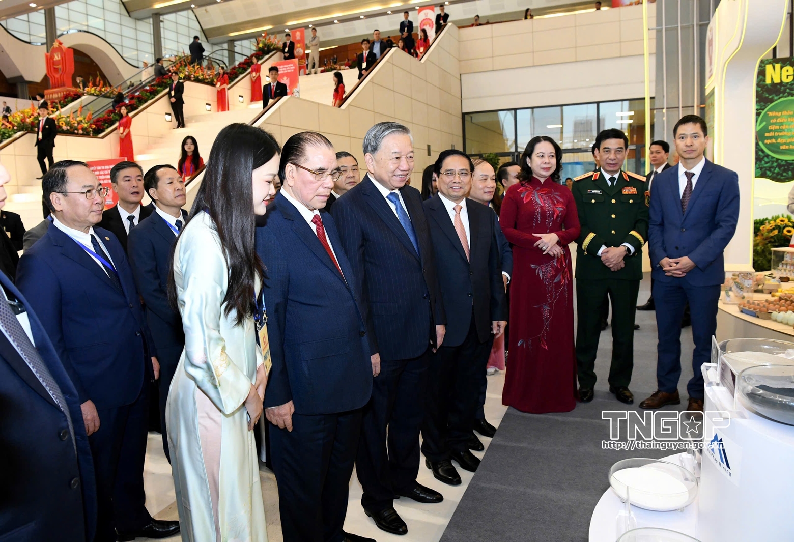 Tổng Bí thư Tô Lâm, nguyên Tổng Bí thư Nông Đức Mạnh cùng Đoàn đại biểu cấp cao ghé thăm khu trưng bày sản phẩm công nghệ cao của Công ty Núi Pháo. (Nguồn: Báo Đại biểu nhân dân)