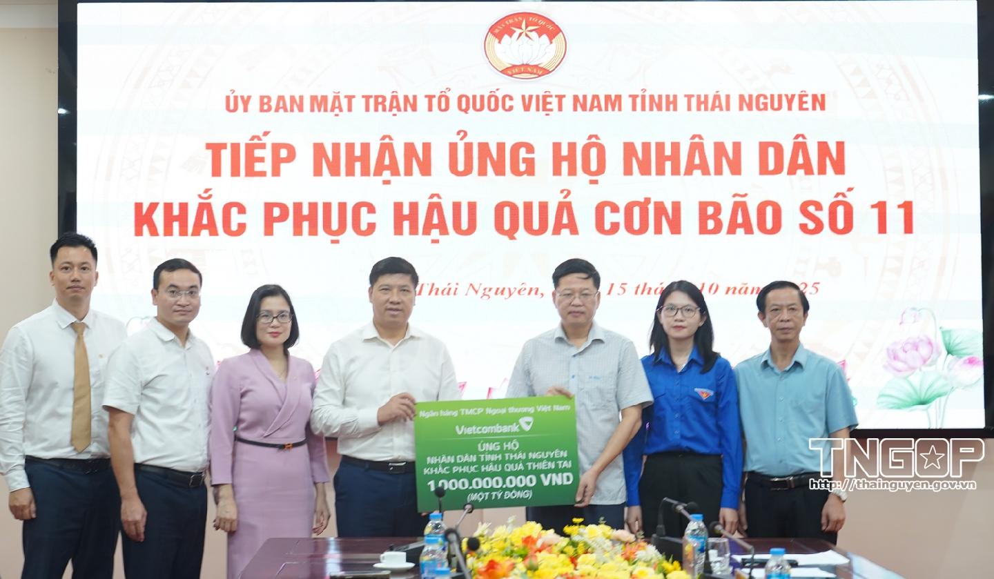 Sáng 15/10, Tại trụ sở Ủy ban MTTQ tỉnh Thái Nguyên, Ngân hàng TMCP Ngoại thương Việt Nam (Vietcombank) đã trao hỗ trợ 1 tỷ đồng để tỉnh Thái Nguyên khắc phục hậu quả mưa lũ. Tiếp đoàn và đón nhận hỗ trợ có đồng chí Đinh Quang Tuyên, Phó Bí thư Tỉnh ủy, Chủ tịch Ủy ban MTTQ tỉnh.
