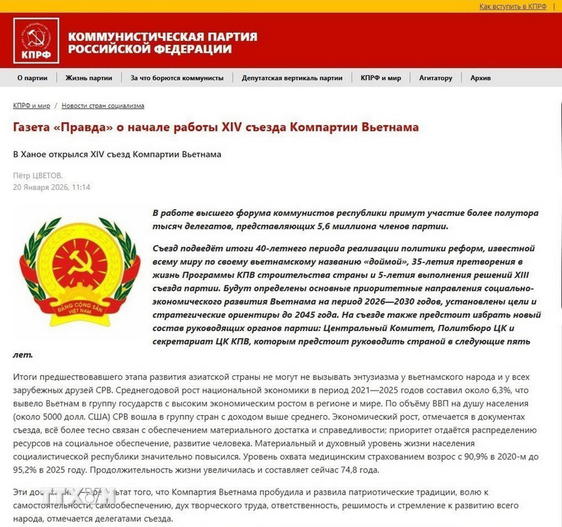 Báo chí Nga đánh giá cao Đại hội XIV và định hướng phát triển vì Nhân dân