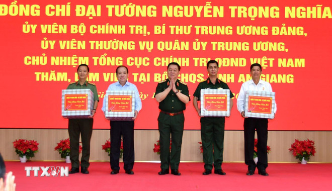 Đại tướng Nguyễn Trọng Nghĩa, Ủy viên Bộ Chính trị, Bí thư Trung ương Đảng, Ủy viên Thường vụ Quân ủy Trung ương, Chủ nhiệm Tổng cục Chính trị Quân đội nhân dân Việt Nam làm trưởng đoàn tặng quà cho các đơn vị. (Ảnh: Văn Sĩ/TTXVN)