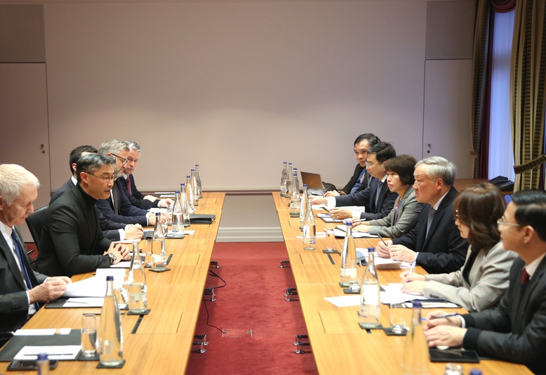 Phó Thủ tướng Thường trực Nguyễn Hòa Bình thông báo tới lãnh đạo cấp cao Thụy Sĩ một số kết quả chính của Đại hội Đảng lần thứ XIV - Ảnh: VGP/Nguyễn Hoàng