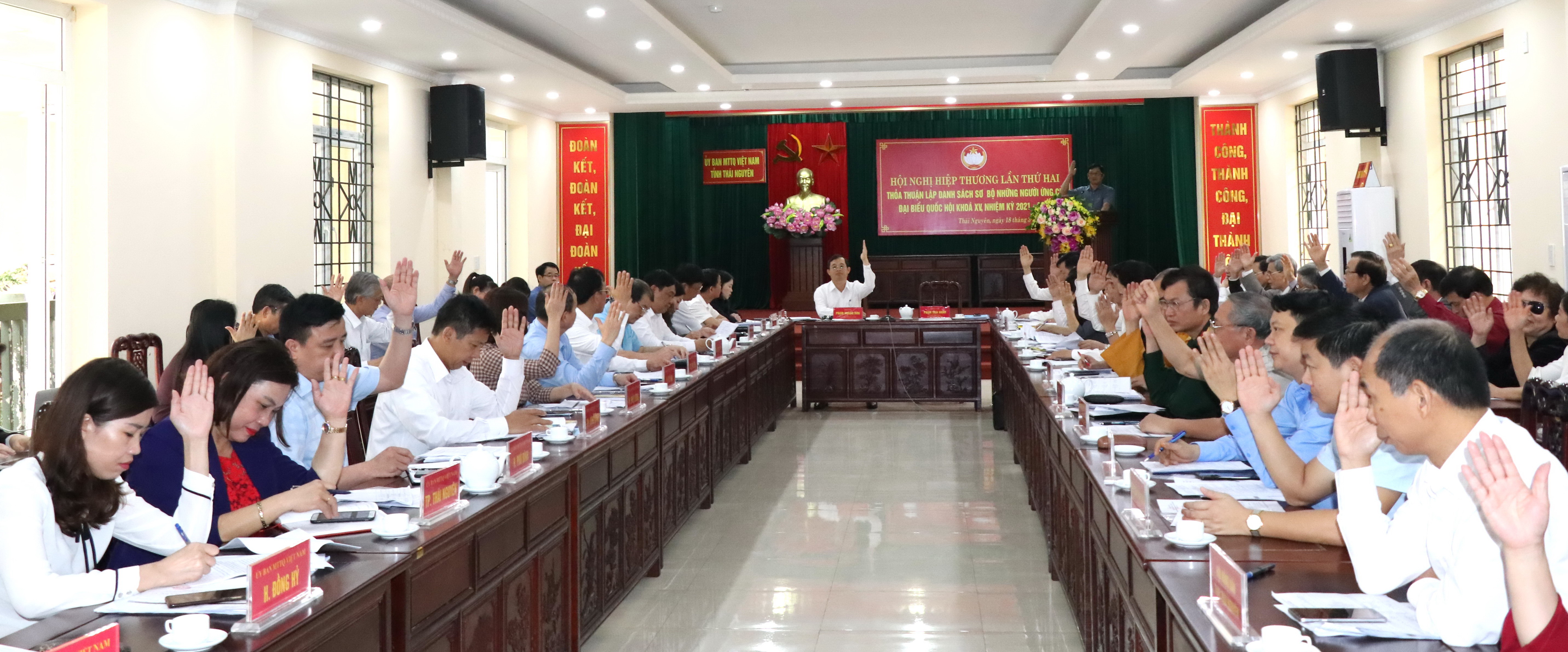Các đại biểu biểu quyết nhất trí lập danh sách sơ bộ những người ứng cử ĐBQH khóa XV của tỉnh Thái Nguyên