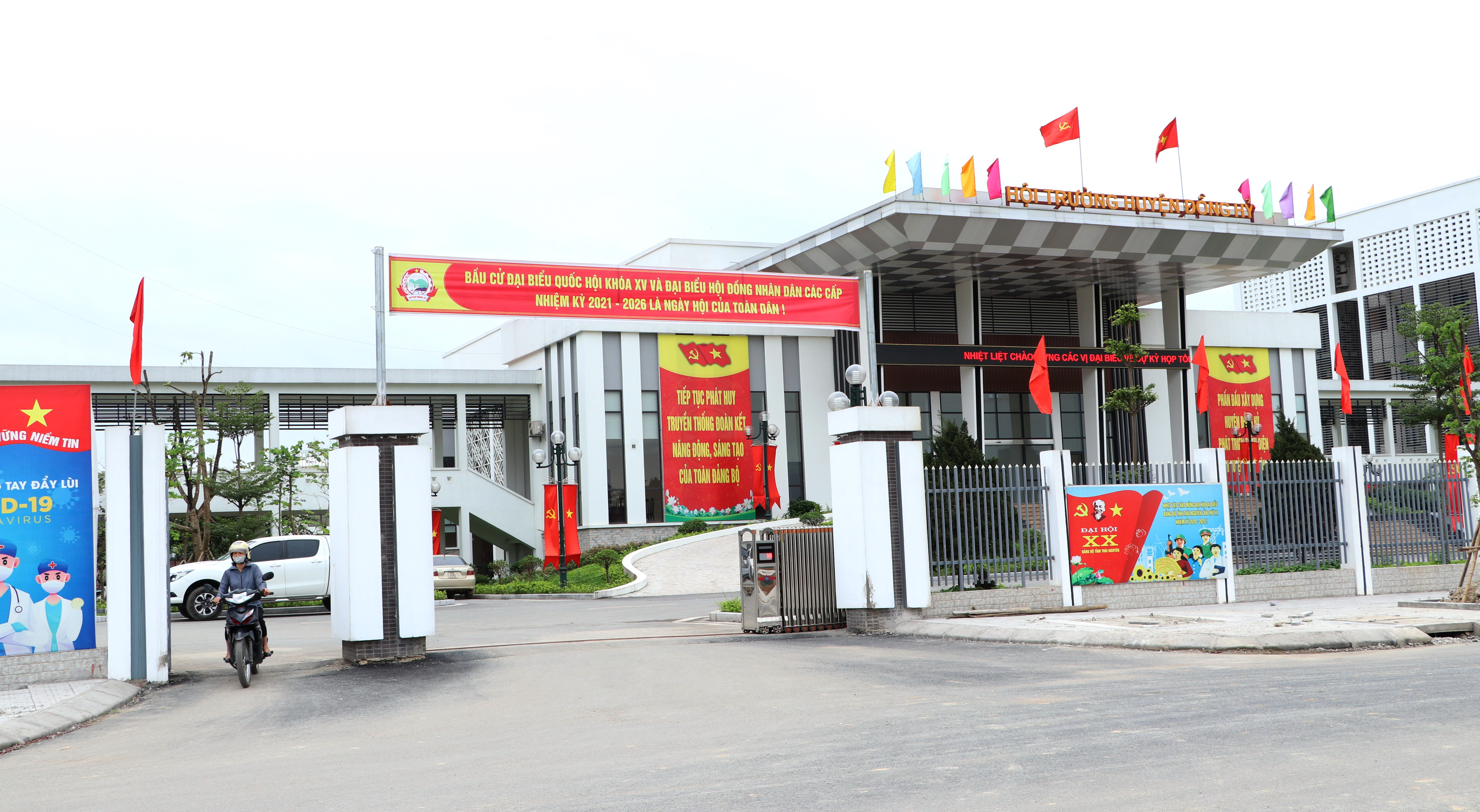 Băng rôn tuyên truyền về cuộc bầu cử được trang hoàng tại cổng trụ sở HĐND - UBND huyện Đồng Hỷ