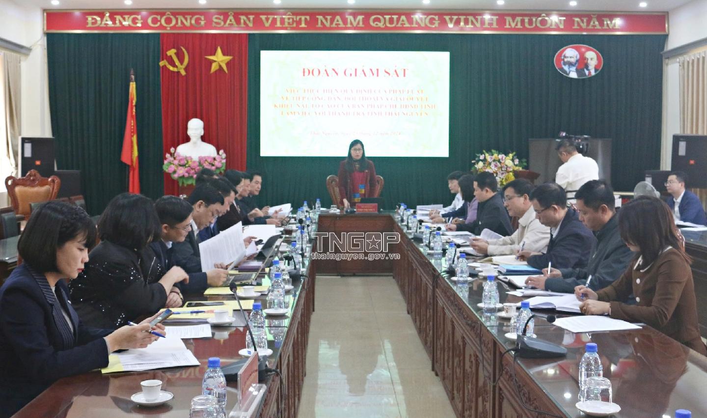 Sáng 17/12, Đoàn Giám sát của Ban Pháp chế HĐND tỉnh do đồng chí Phó Thị Thủy, Phó Trưởng Ban Pháp chế HĐND tỉnh làm Trưởng Đoàn đã giám sát tại UBND TP. Thái Nguyên về việc thực hiện quy định của pháp luật trong tiếp công dân, đối thoại và giải quyết đơn thư khiếu nại tố cáo. Cùng dự có lãnh đạo MTTQ tỉnh; Thanh tra tỉnh và một số đơn vị liên quan.