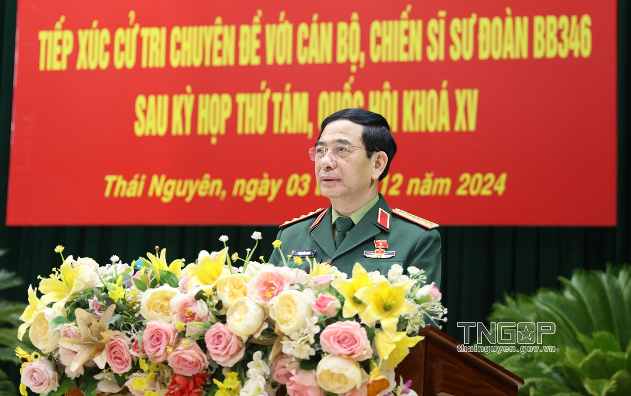 Sáng nay (3/12), Đại tướng Phan Văn Giang, Ủy viên Bộ Chính trị, Phó Bí thư Quân ủy Trung ương, Bộ trưởng Bộ Quốc phòng và đồng chí Nguyễn Thanh Hải, Ủy viên BCH Trung ương Đảng, Ủy viên Ủy ban Thường vụ Quốc hội, Trưởng Ban Công tác đại biểu Quốc hội (ĐBQH), Phó Trưởng Ban Tổ chức Trung ương cùng các ĐBQH tỉnh Thái Nguyên đã tiếp xúc cử tri chuyên đề với cán bộ, chiến sĩ Sư đoàn 346, Quân khu 1 (xã Yên Đổ, huyện Phú Lương) sau Kỳ họp thứ Tám, Quốc hội khóa XV.