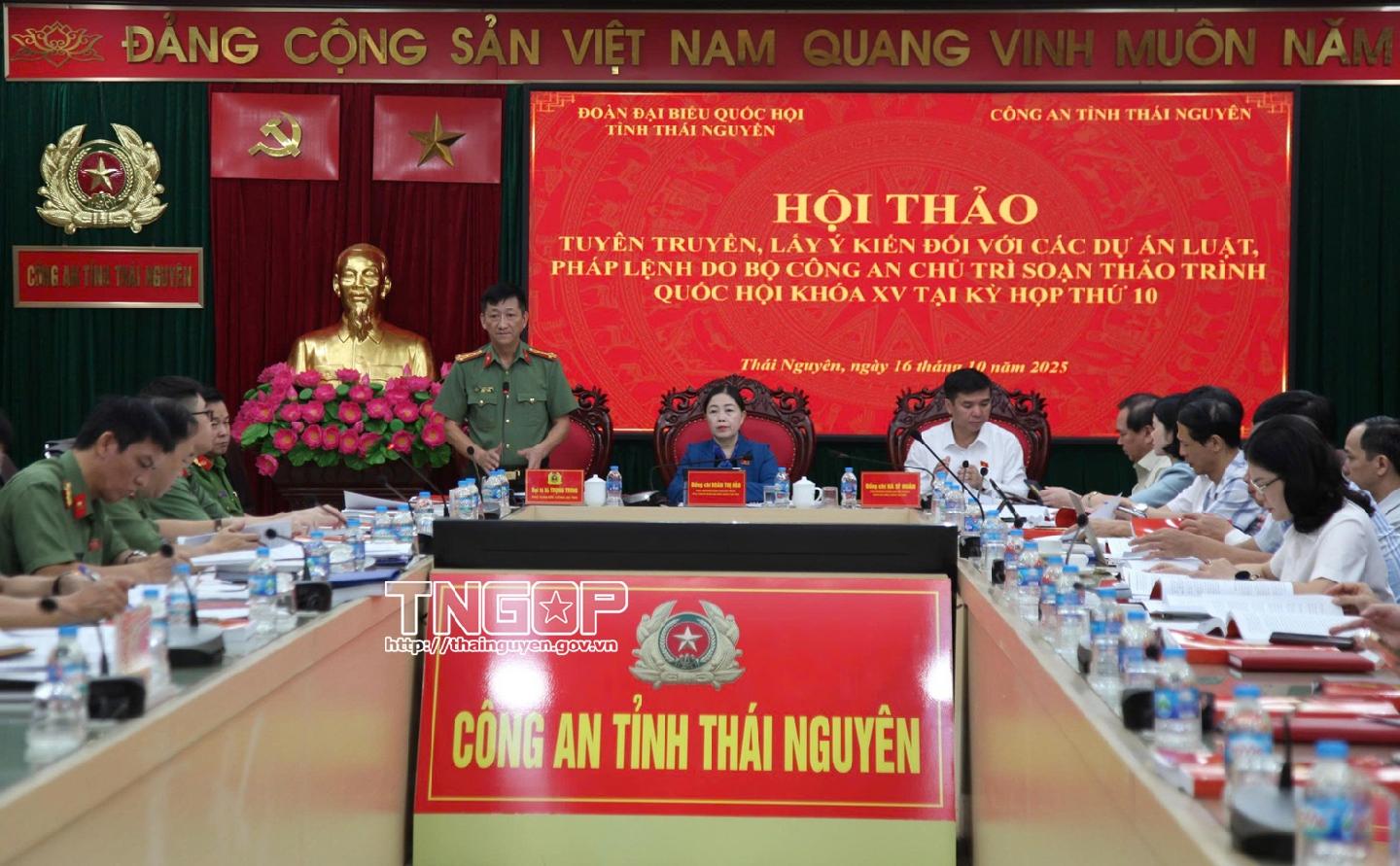 Ngày 16/10, Công an tỉnh Thái Nguyên phối hợp với Đoàn Đại biểu Quốc hội tỉnh tổ chức Hội thảo tuyên truyền, lấy ý kiến đối với các dự án luật, pháp lệnh do Bộ Công an chủ trì soạn thảo, dự kiến trình Quốc hội khóa XV xem xét, thông qua tại Kỳ họp thứ 10.