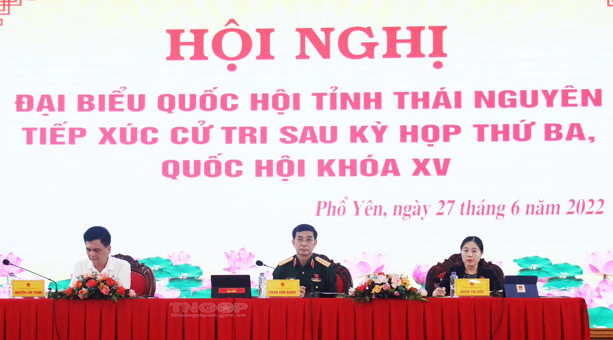 Sáng ngày 27/6, các ĐBQH tỉnh Thái Nguyên: Đại tướng Phan Văn Giang, Ủy viên Bộ Chính trị, Phó Bí thư Quân ủy Trung ương, Bộ trưởng Bộ Quốc phòng; Nguyễn Lâm Thành, Phó Chủ tịch Hội đồng Dân tộc của Quốc hội, Chủ tịch Nhóm Nghị sĩ hữu nghị Việt Nam - Hy Lạp; Đoàn Thị Hảo, Ủy viên BTV Tỉnh ủy, Phó Trưởng đoàn chuyên trách Đoàn ĐBQH tỉnh Thái Nguyên đã tiếp xúc cử tri TP. Phổ Yên sau Kỳ họp thứ ba, Quốc hội khóa XV.