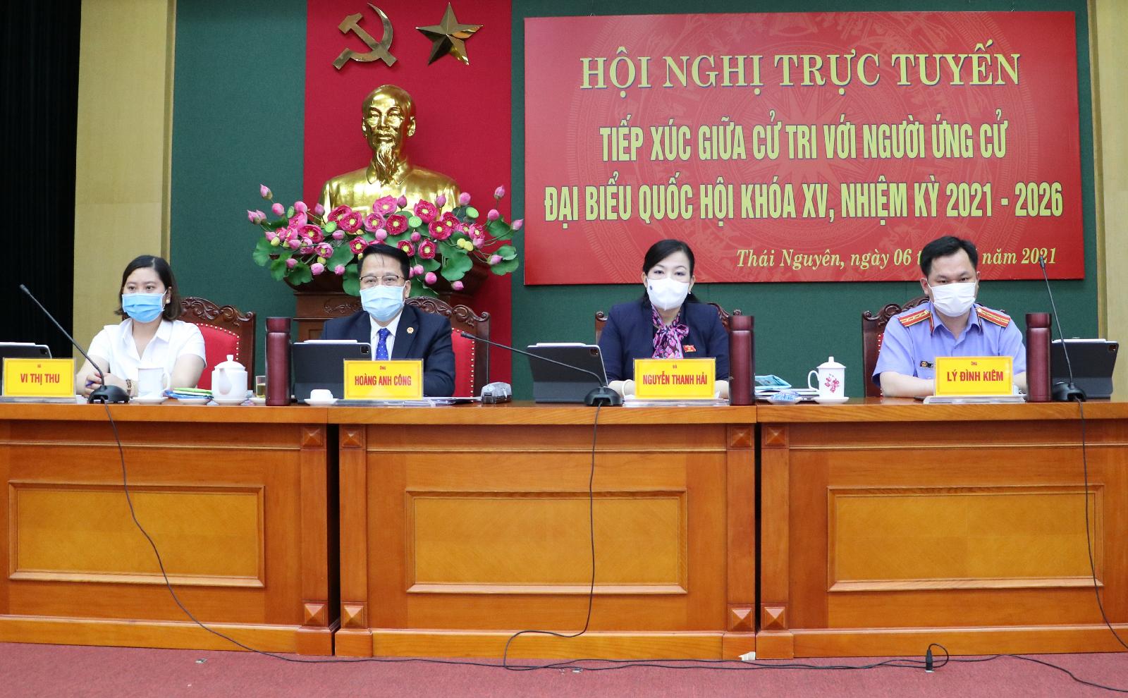 Sáng ngày 10/5, tại Tỉnh ủy Thái Nguyên, Ban Thường trực Ủy ban MTTQ tỉnh tổ chức Hội nghị trực tuyến tiếp xúc giữa cử tri với người ứng cử đại biểu Quốc hội khóa XV, nhiệm kỳ 2021 - 2026 tại Đơn vị bầu cử số 2 gồm thành phố Thái Nguyên, huyện Đồng Hỷ và huyện Võ Nhai.
