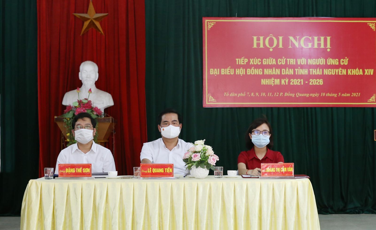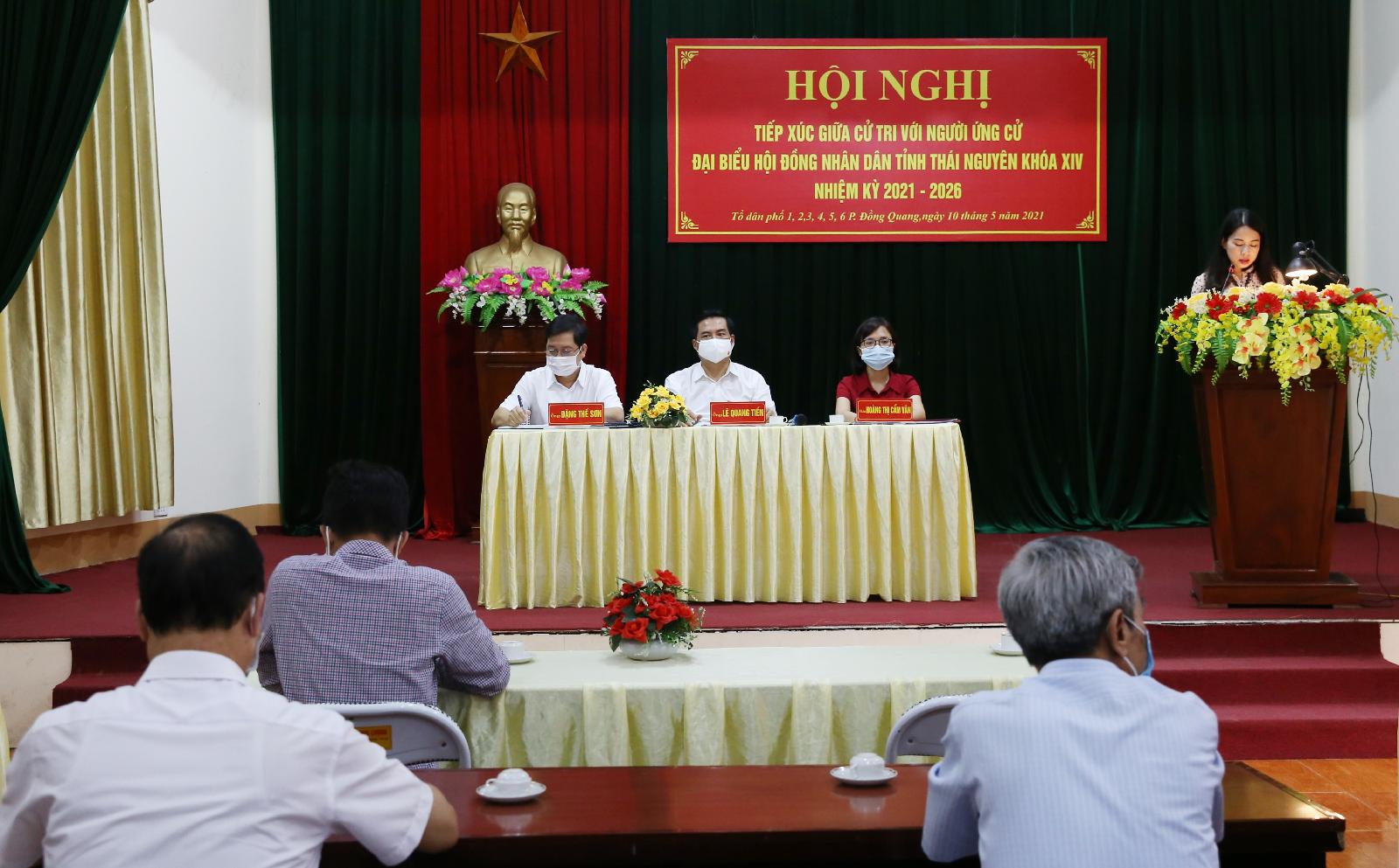Chiều ngày 10/5, tại Nhà văn hóa tổ 12, phường Đồng Quang (TP. Thái Nguyên), Ban Thường trực Ủy ban MTTQ tỉnh tổ chức Hội nghị tiếp xúc giữa cử tri các Tổ dân phố 7, 8, 9, 10, 11, 12 phường Đồng Quang với người ứng cử đại biểu HĐND tỉnh Thái Nguyên khóa XIV, nhiệm kỳ 2021 - 2026 tại Đơn vị bầu cử số 2.