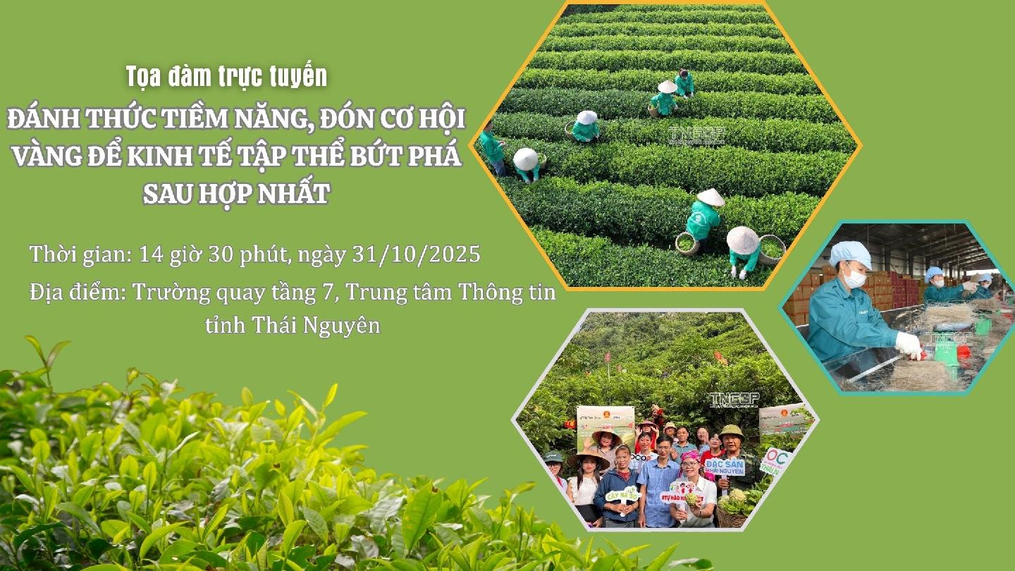 Vào lúc 14 giờ 30 phút ngày 31/10, Trung tâm Thông tin tỉnh Thái Nguyên tổ chức Chương trình Tọa đàm trực tuyến trên Cổng Thông tin điện tử tỉnh với chủ đề: Đánh thức tiềm năng, đón cơ hội vàng để kinh tế tập thể bứt phá sau hợp nhất.