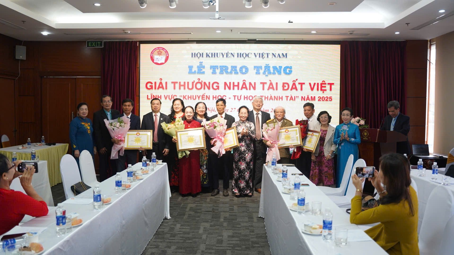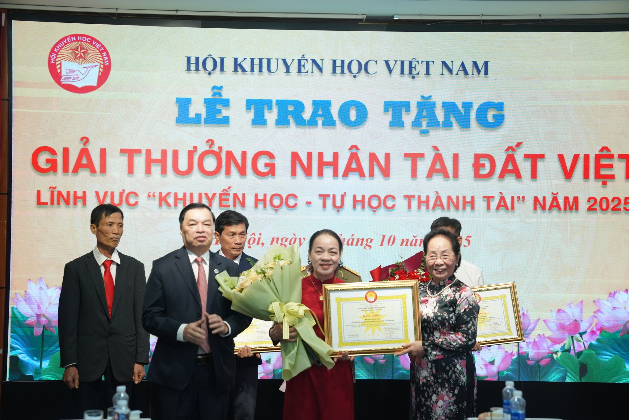 Trước đó, chiều ngày 27/10, bà Đào Thanh Hảo được Chủ tịch Hội Khuyến học Việt Nam tặng Bằng khen tại Lễ trao tặng Giải thưởng Nhân tài Đất Việt 2025 lĩnh vực "Khuyến học - Tự học thành tài"