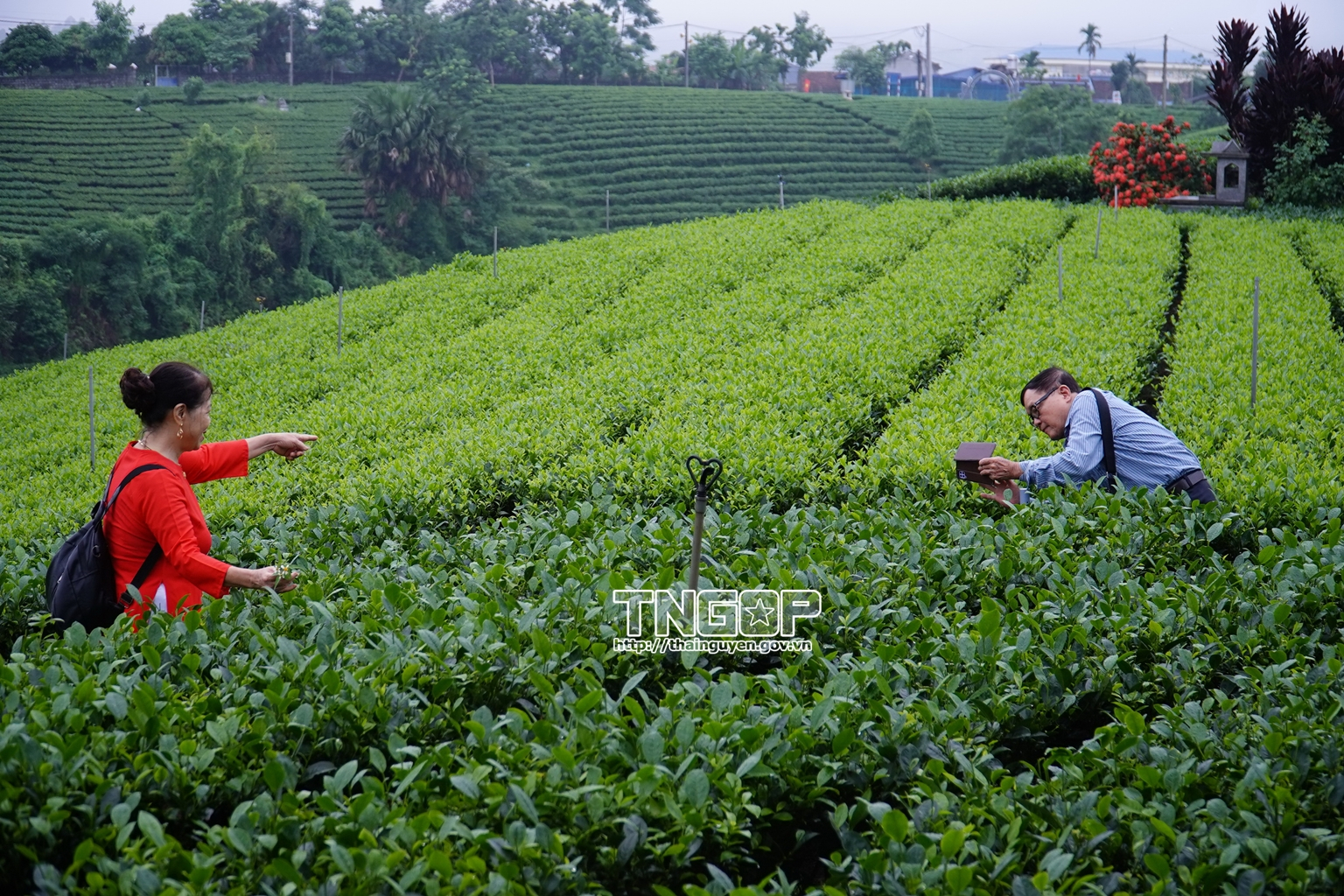 Du khách chụp ảnh tại đồi chè Cầu Đá, xã La Bằng