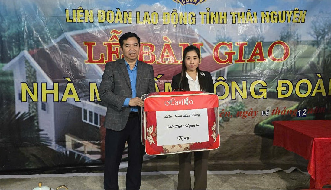 Đại diện LĐLĐ tỉnh Thái Nguyên tặng quà cho đoàn viên Dương Thị Đạt (công nhân Công ty TNHH Samsung Electronics Việt Nam - Thái Nguyên) trong Lễ bàn giao nhà "Mái ấm công đoàn" (ảnh minh họa)