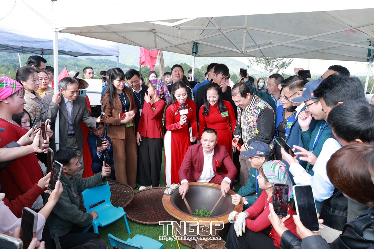 Du khách hào hứng tham gia hoạt động trải nghiệm chế biến chè bằng phương pháp thủ công - một hoạt động đặc sắc nằm trong khuôn khổ Lễ hội "Thái Nguyên - Hương sắc danh trà"