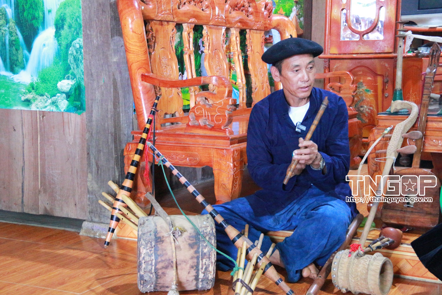 Ông Chảo Phái Lừ bên những nhạc cụ dân tộc do chính mình chế tác