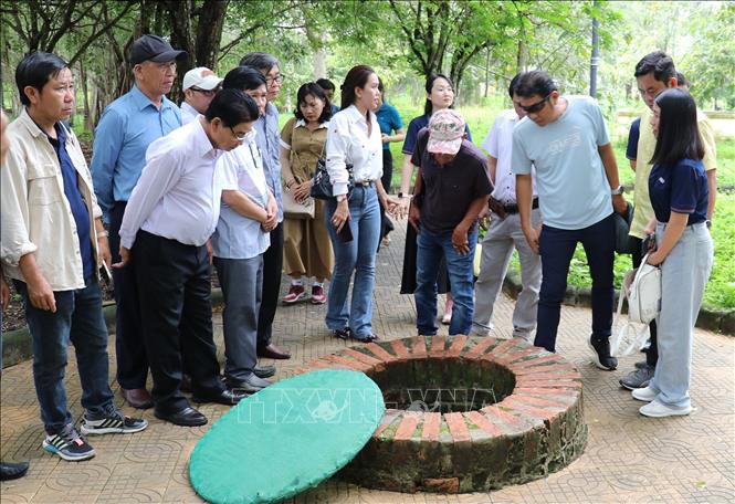 Du khách tìm hiểu về sự tích giếng nước ngọt ở Di tích Lăng mộ Hoàng gia tại phường Sơn Quy, tỉnh Đồng Tháp.