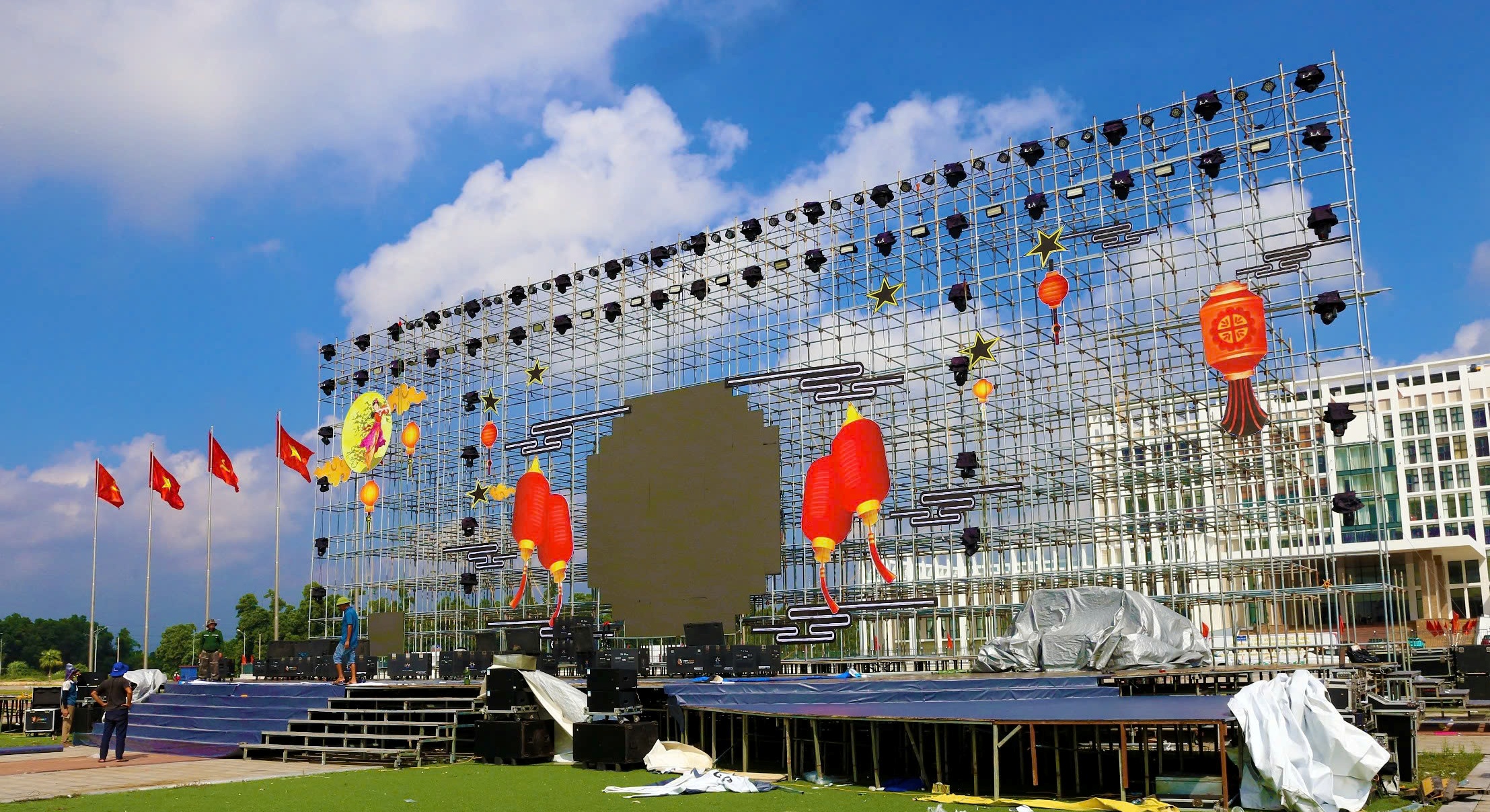 Sân khấu tại Quảng trường Vạn Xuân đang được tích cực lắp đặt để sẵn sàng cho Chương trình. (Ảnh: Thành Chung)
