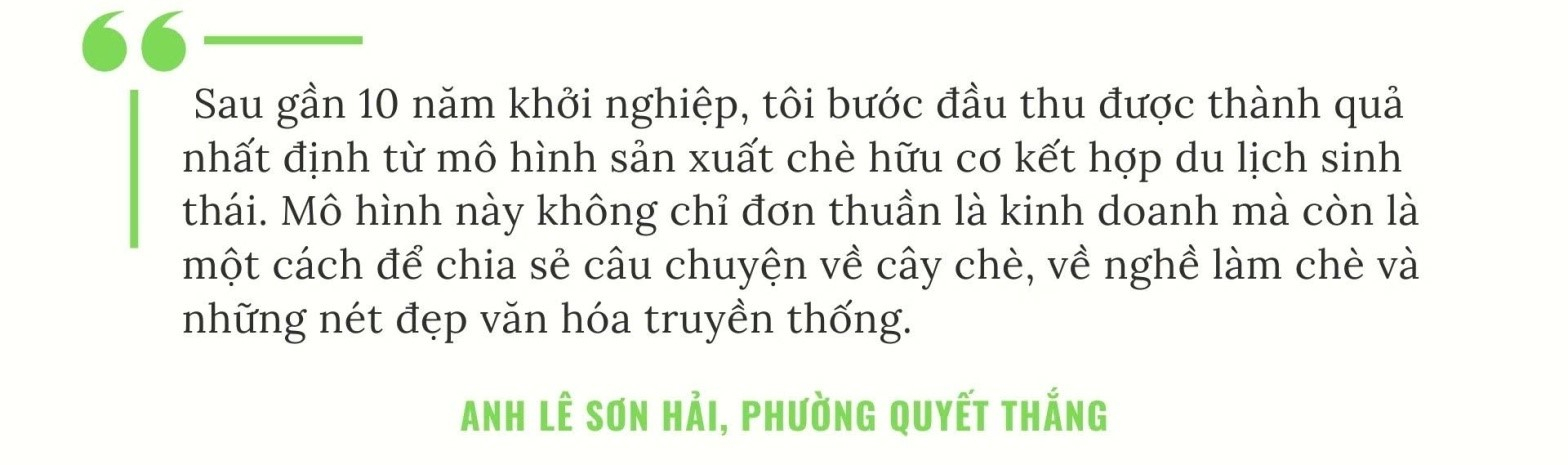 Không chỉ làm chủ công nghệ, một thế hệ trẻ đang tiếp nối và làm mới nghề chè bằng sự sáng tạo và bản lĩnh khởi nghiệp. Họ mang đến luồng gió mới cho Tân Cương, La Bằng và nhiều vùng chè nổi tiếng khác của Thái Nguyên. Với khát vọng khẳng định thương hiệu quê hương, những người trẻ mạnh dạn thử nghiệm giống mới, áp dụng quy trình canh tác bền vững, xây dựng chuỗi giá trị gắn kết từ sản xuất đến tiêu thụ. Từ bàn tay của lớp nông dân trẻ, cây chè vừa gìn giữ được truyền thống, vừa phát triển theo hướng sản xuất sạch VietGAP, hữu cơ, gắn với đăng ký thương hiệu; đồng thời đổi mới bao bì, mẫu mã và đẩy mạnh tiêu thụ qua các kênh trực tuyến.