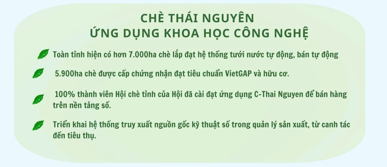 Cùng với ứng dụng khoa học kỹ thuật, chuyển đổi số đã mở ra hướng đi mới cho ngành chè Thái Nguyên. Việc áp dụng mã QR, tem điện tử, truy xuất nguồn gốc gắn với xây dựng thương hiệu số và thương mại điện tử giúp sản phẩm chè có mặt tại nhiều thị trường trong và ngoài nước. Được sự hỗ trợ của chính quyền và cơ quan chuyên môn, các doanh nghiệp, HTX chú trọng hơn đến mẫu mã, bao bì, quảng bá sản phẩm qua sàn thương mại điện tử và mạng xã hội, qua đó mở rộng thị phần, nâng cao uy tín.