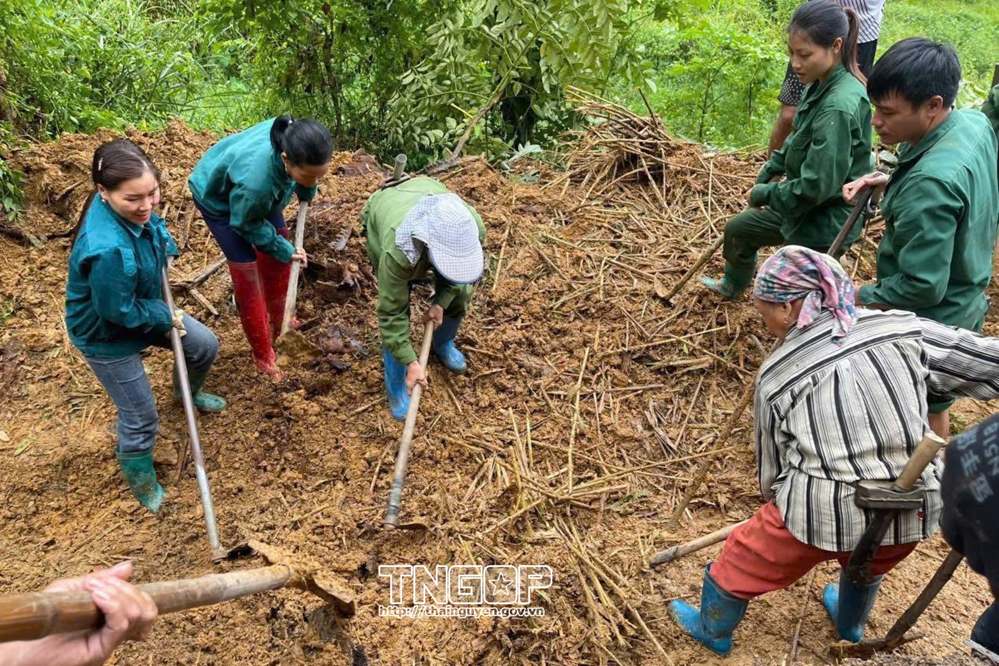 Chị em phụ nữ xã Nghĩa Tá hỗ trợ dọn đường giao thông