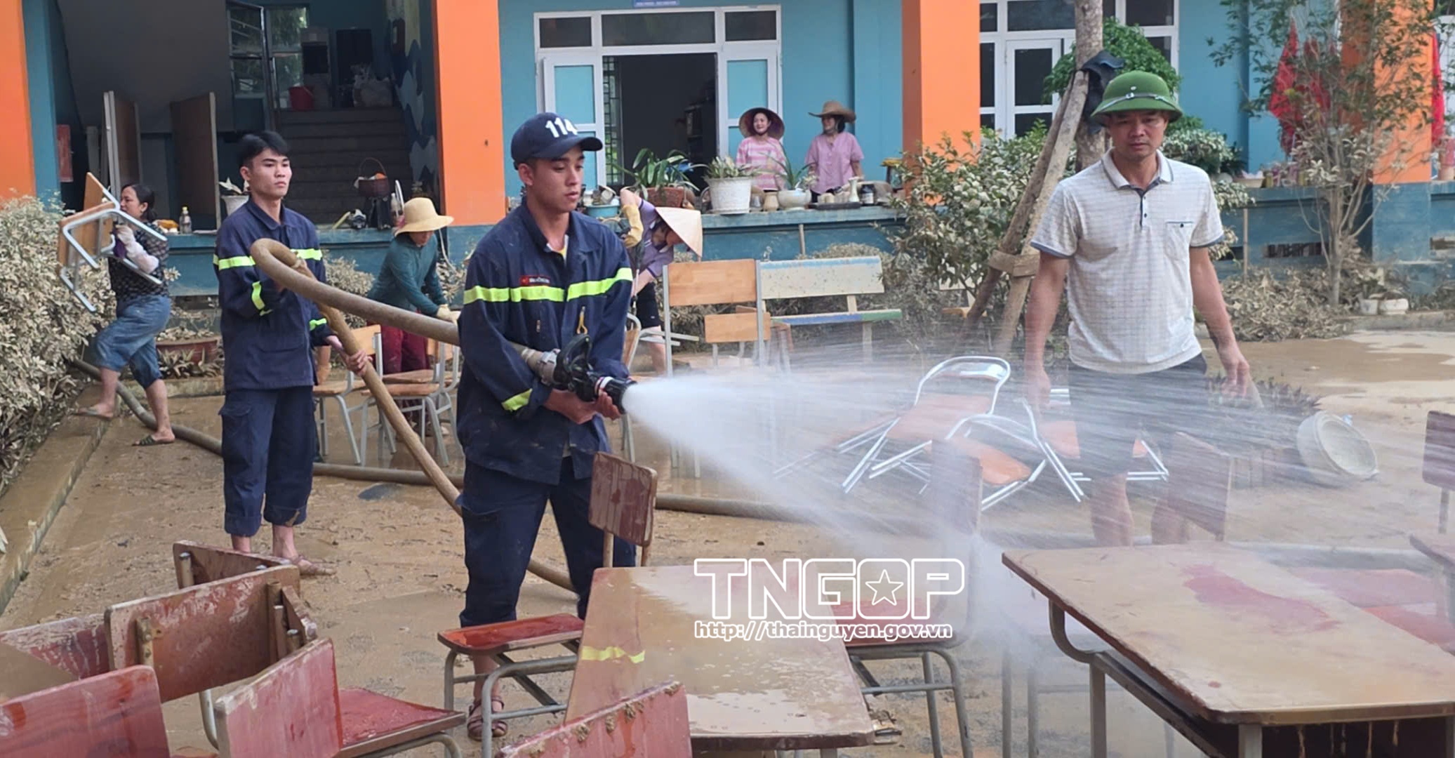 Cảnh sát PCCC & CNCH dùng lăng phun nước vệ sinh, làm sạch phòng học, bàn ghế tại Trường Tiểu học và THCS 915 Gia Sàng