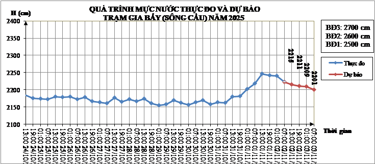 - Diễn biến xu thế mực nước: Trong 24 giờ tới, trên sông Cầu mực nước tại các trạm thuỷ văn Cầu Phà, Gia Bẩy và Chã tiếp tục biến đổi chậm; Tại các trạm Thác Giềng, Chợ Mới mực nước dao động theo điều tiết của thủy điện Thác Giềng 1.