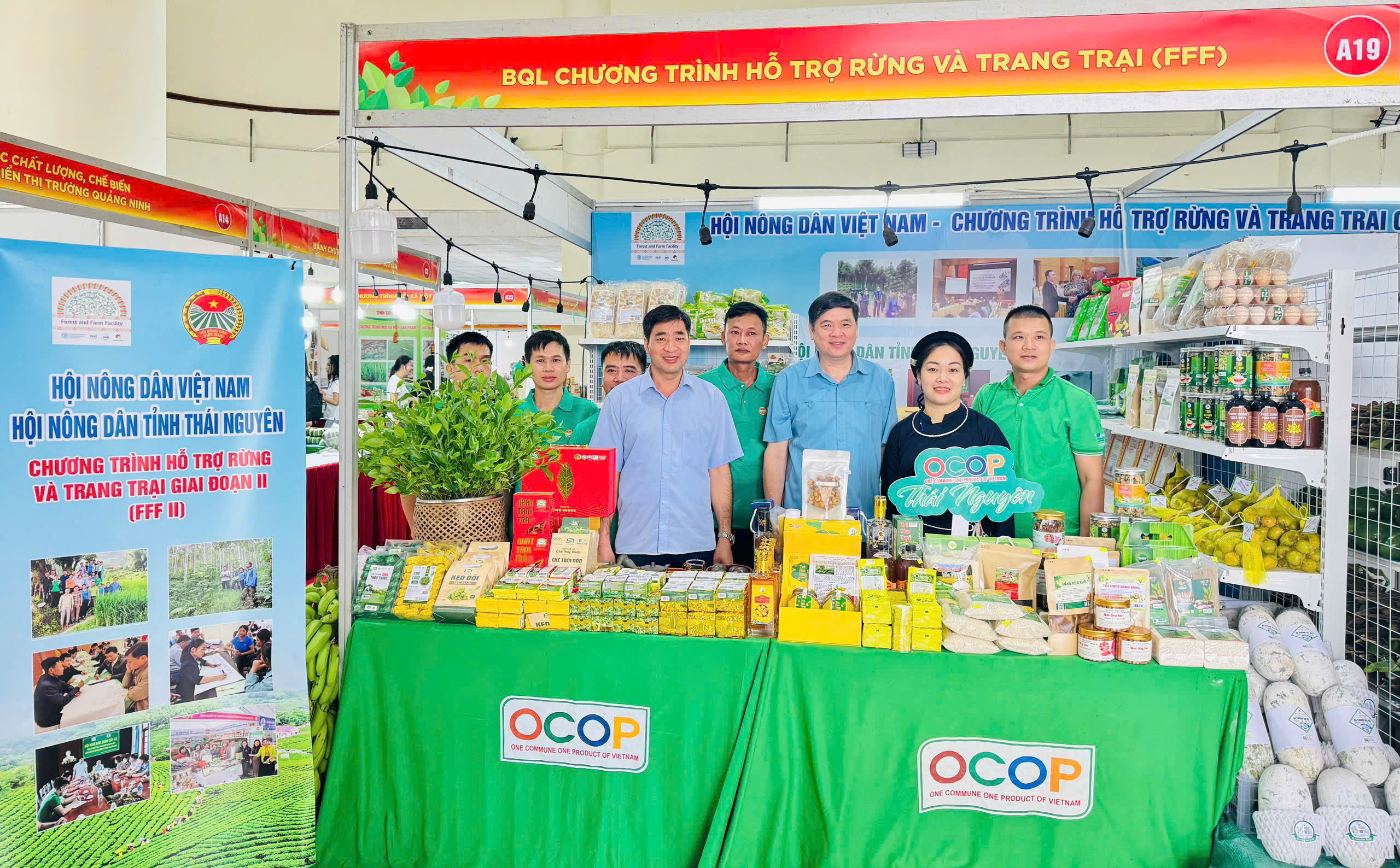 Đồng chí Phan Thanh Hà, Uỷ viên Ban Chấp hành Đảng bộ tỉnh, Phó Chủ tịch Uỷ ban MTTQ tỉnh chụp ảnh cùng hộ sản xuất kinh doanh giỏi tại gian hàng trưng bày giới thiệu sản phẩm OCOP diễn ra tại Hà Nội