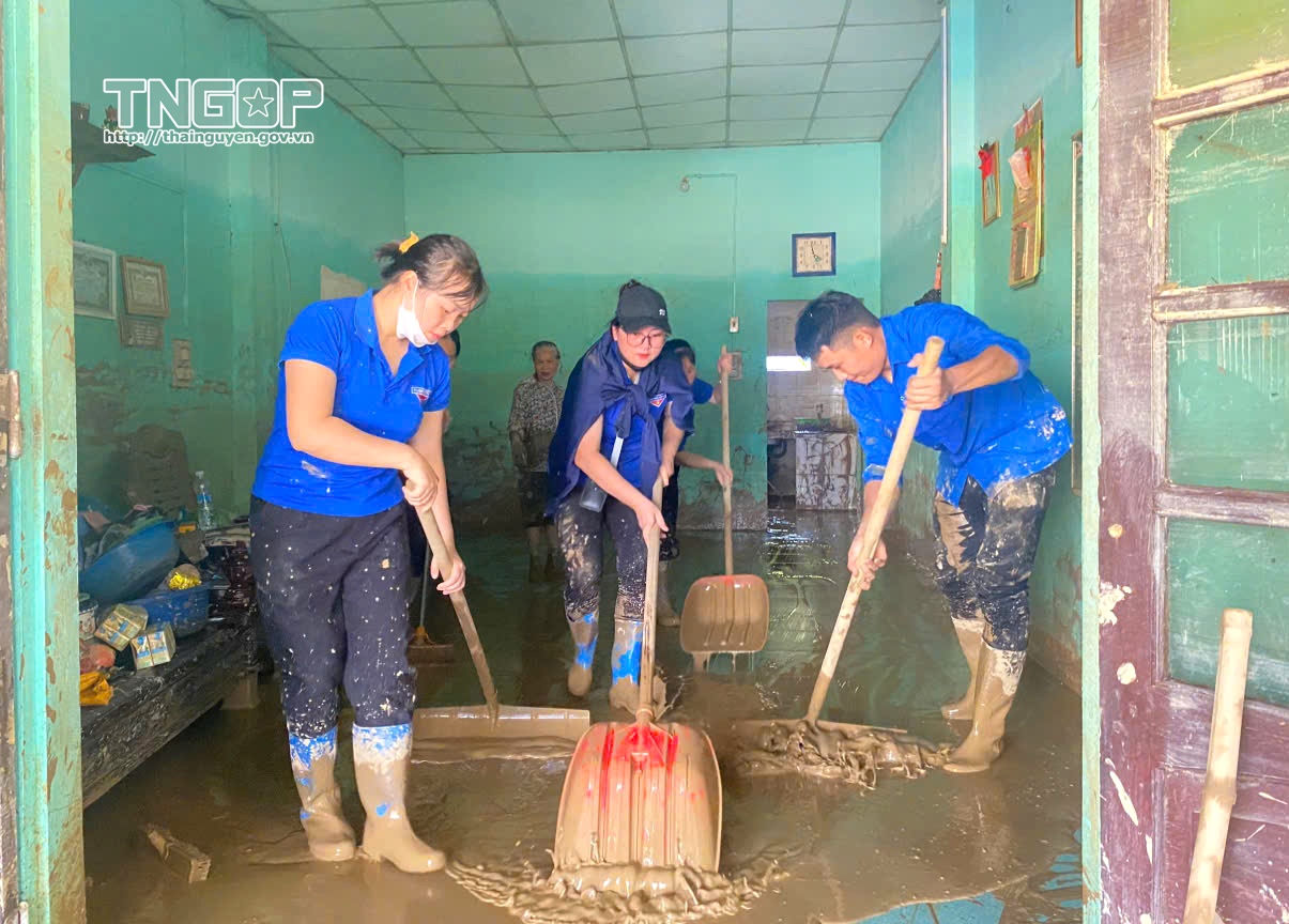 Đoàn viên, thanh niên hỗ trợ người dân dọn dẹp nhà cửa, bùn đất